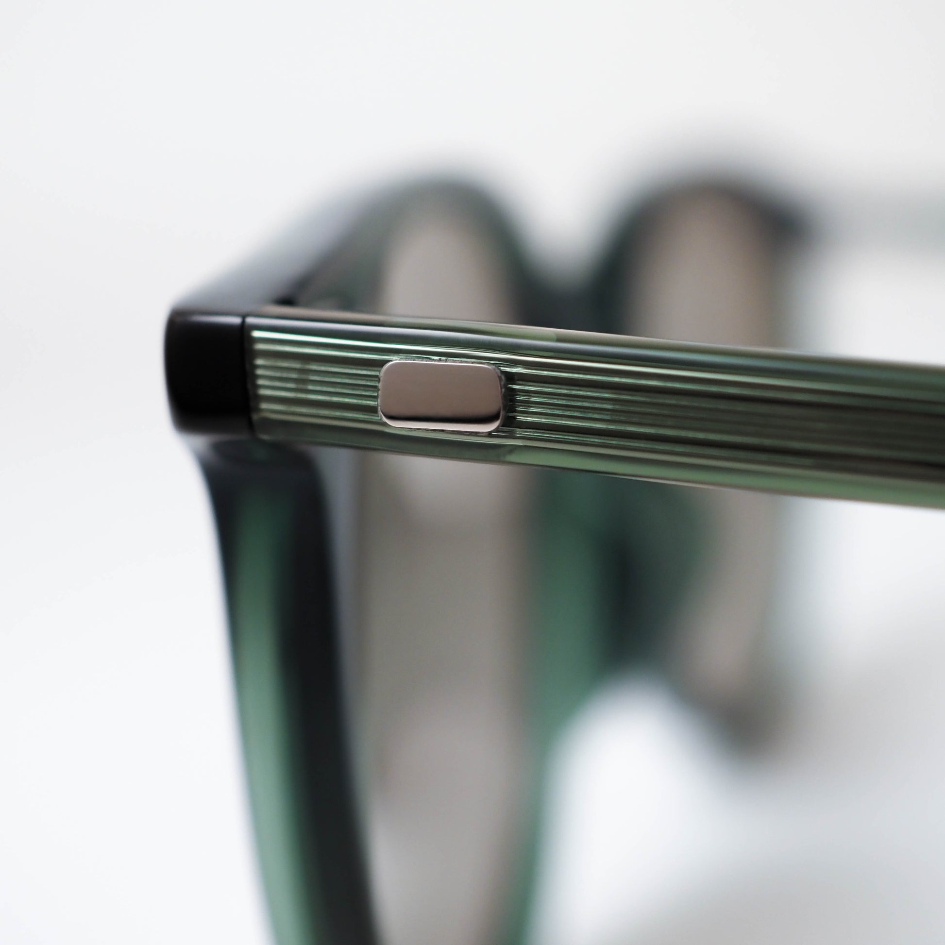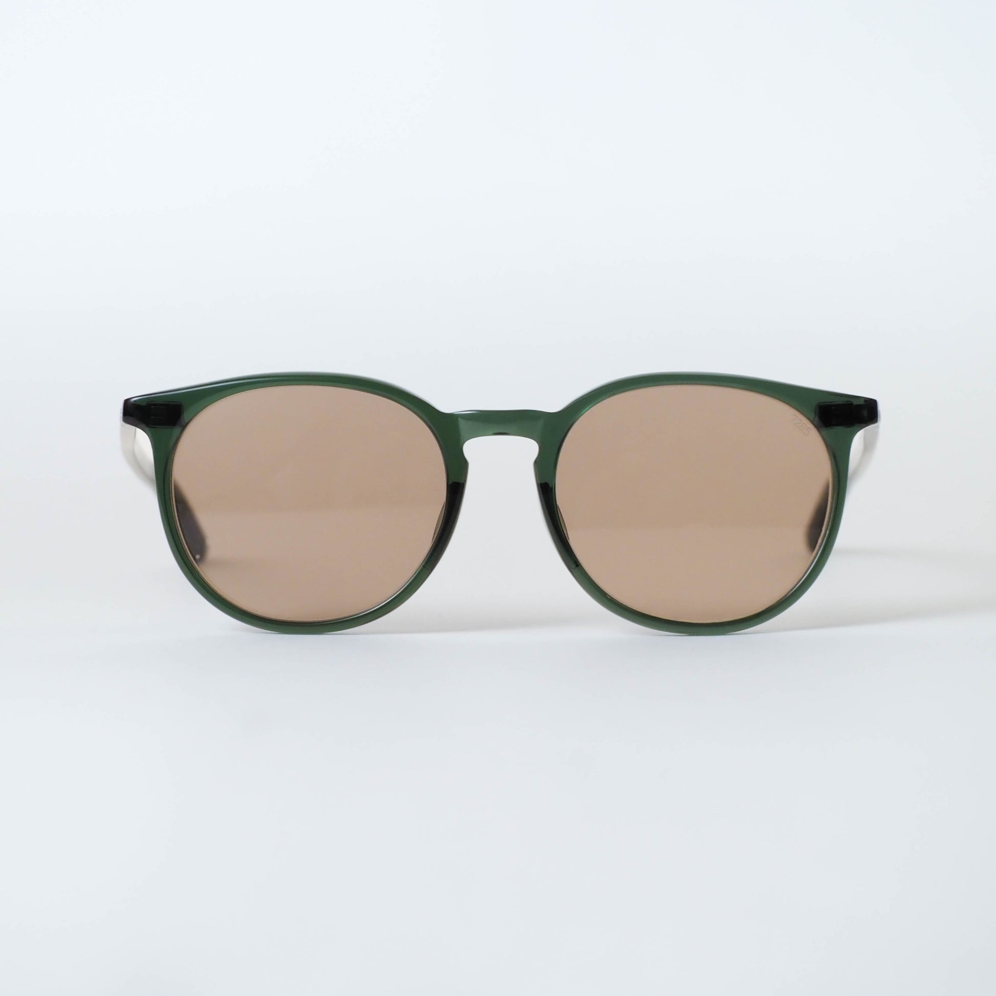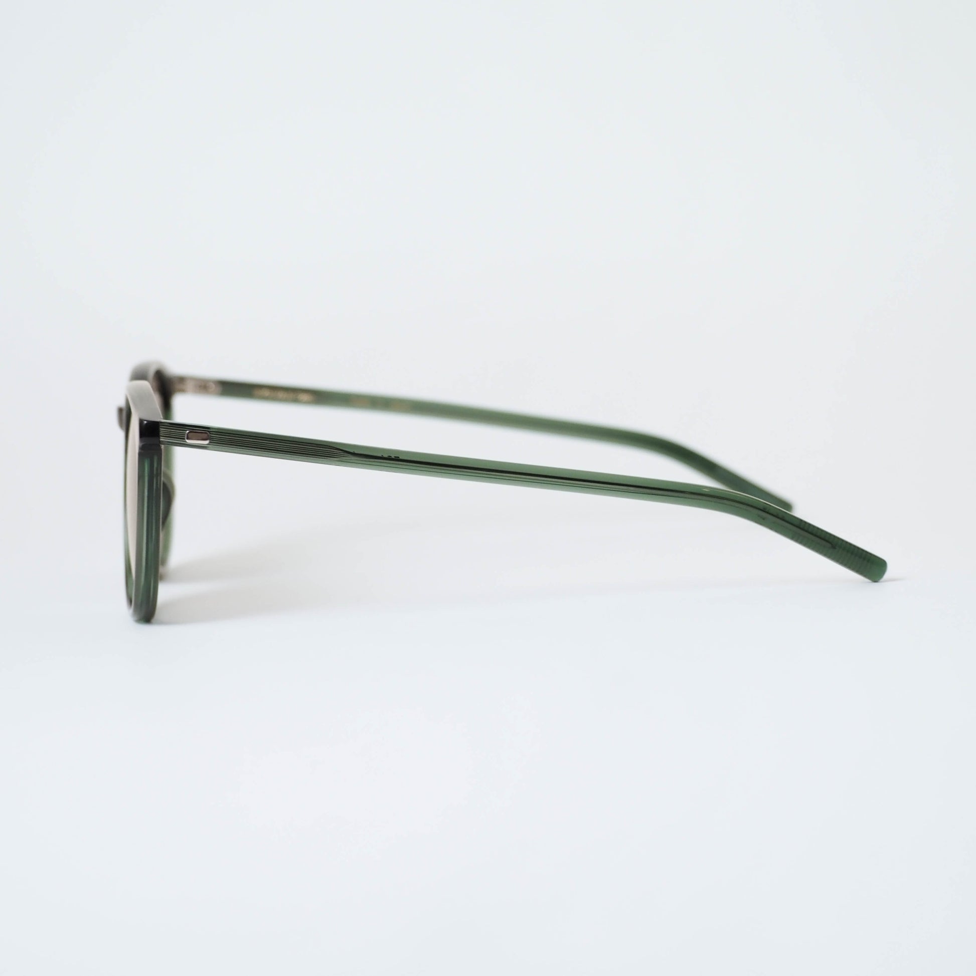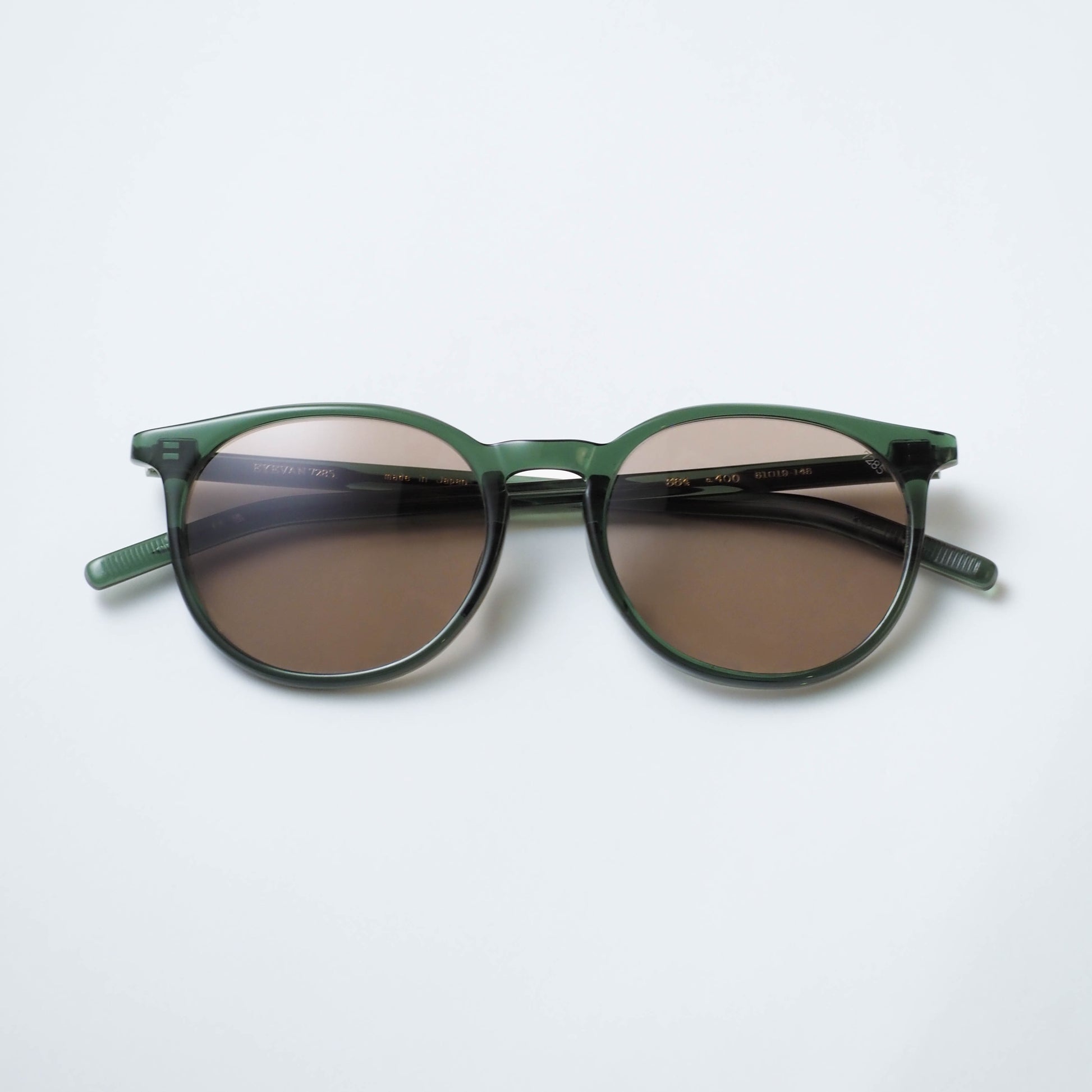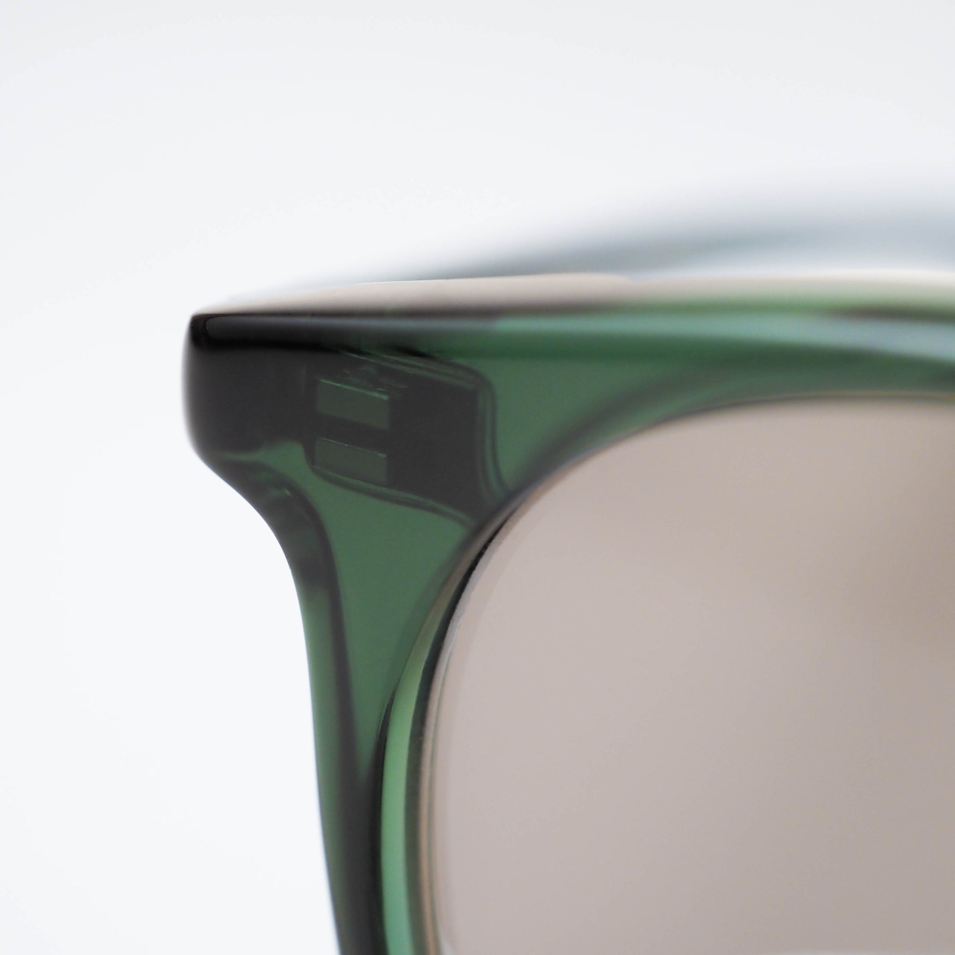 col.400は、透明感のあるグリーンのフレームに、美しいブラウンのガラスレンズを組み合わせたカラー。軽やかさの中に深みがあり、光の当たり方で表情が変わるのも特徴です。落ち着いたトーンながら、しっかりと個性を感じさせてくれます。
