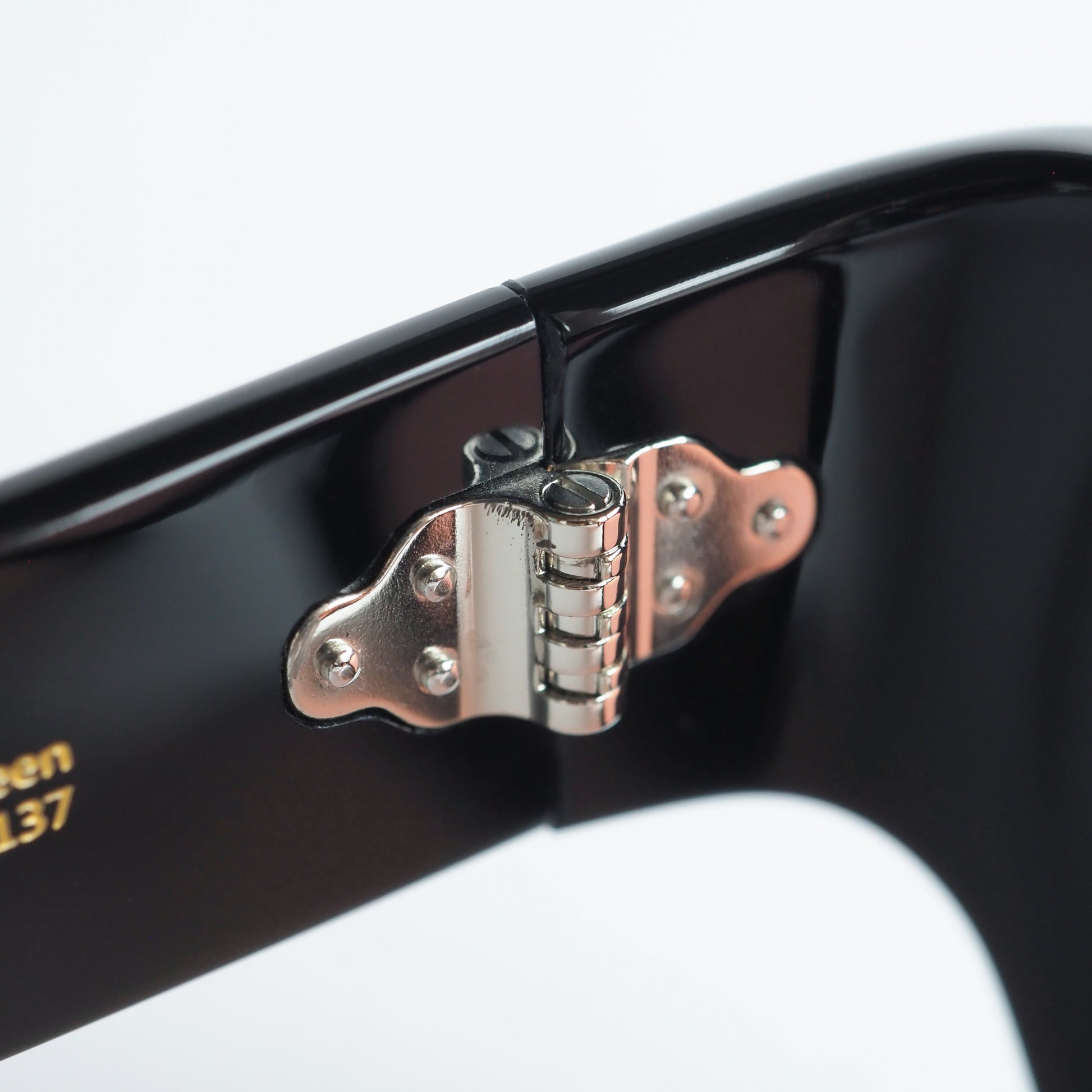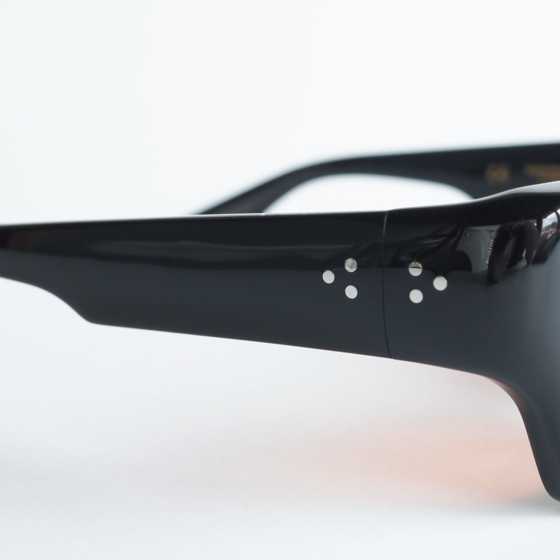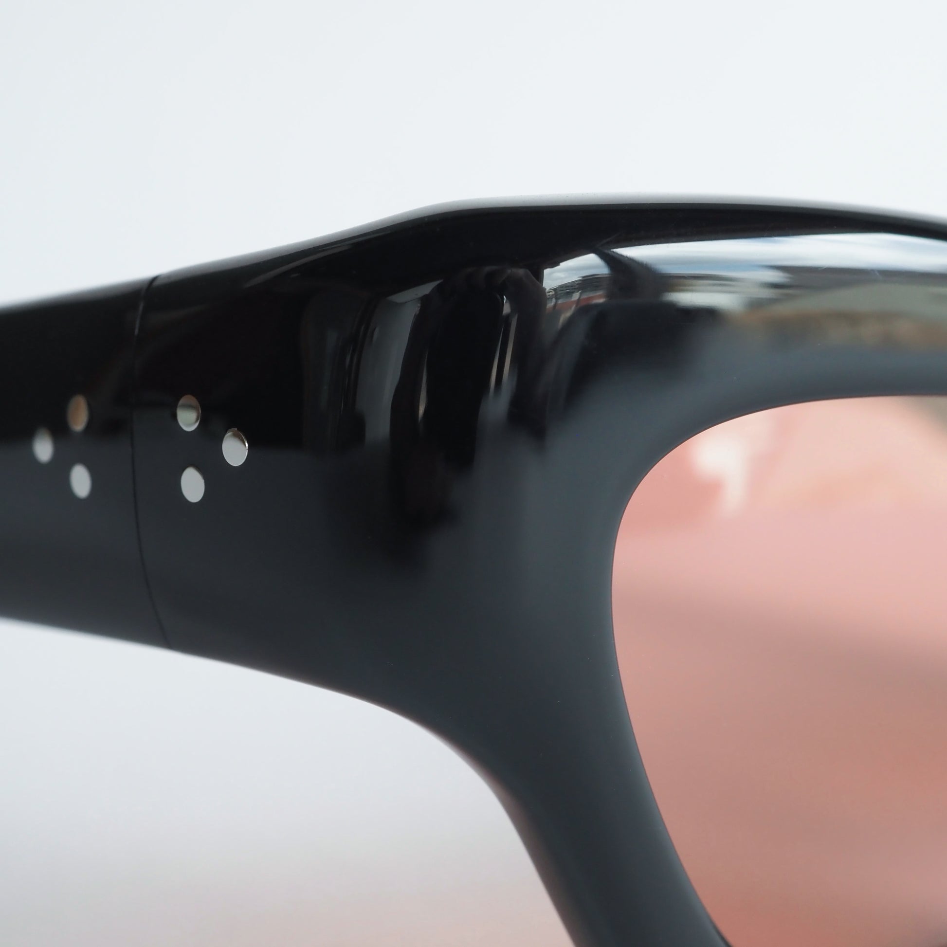 深みのあるブラックのアセテートフレームに、ほんのり赤味を帯びた “Wardi(ワルディ)” レンズを組み合わせた、ひと味違う存在感を放つ一本。
