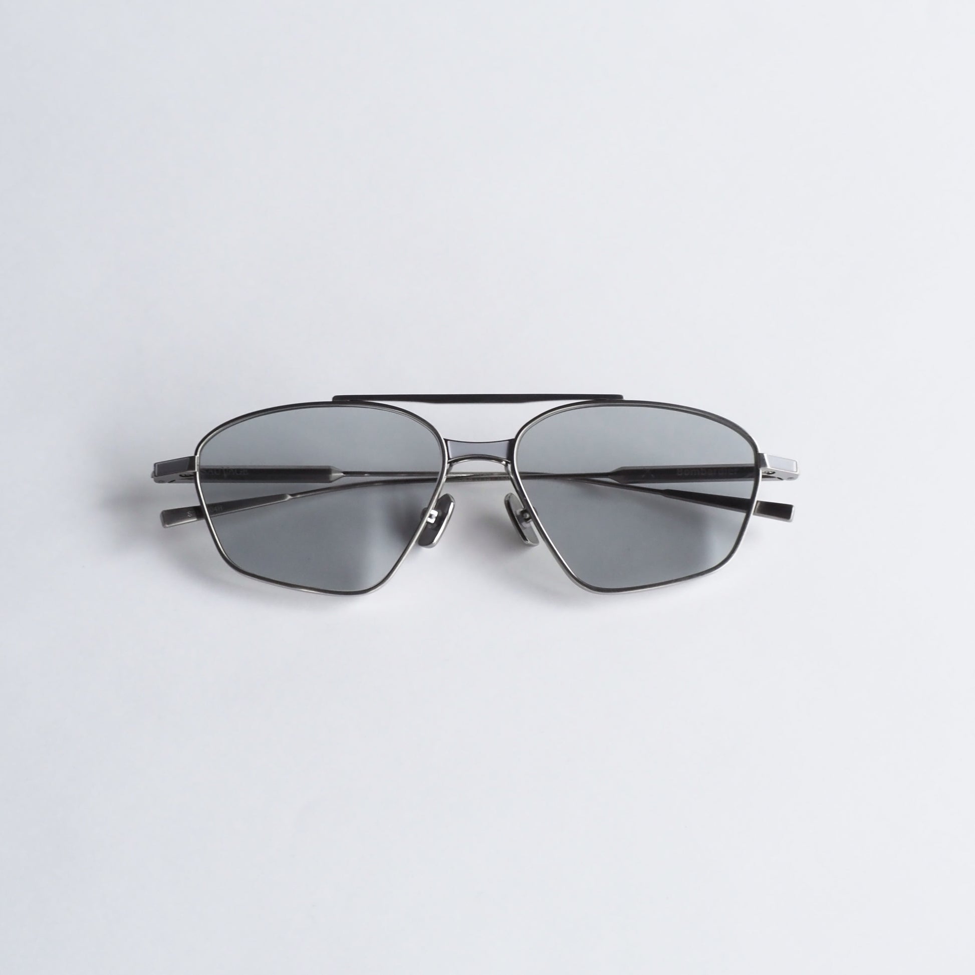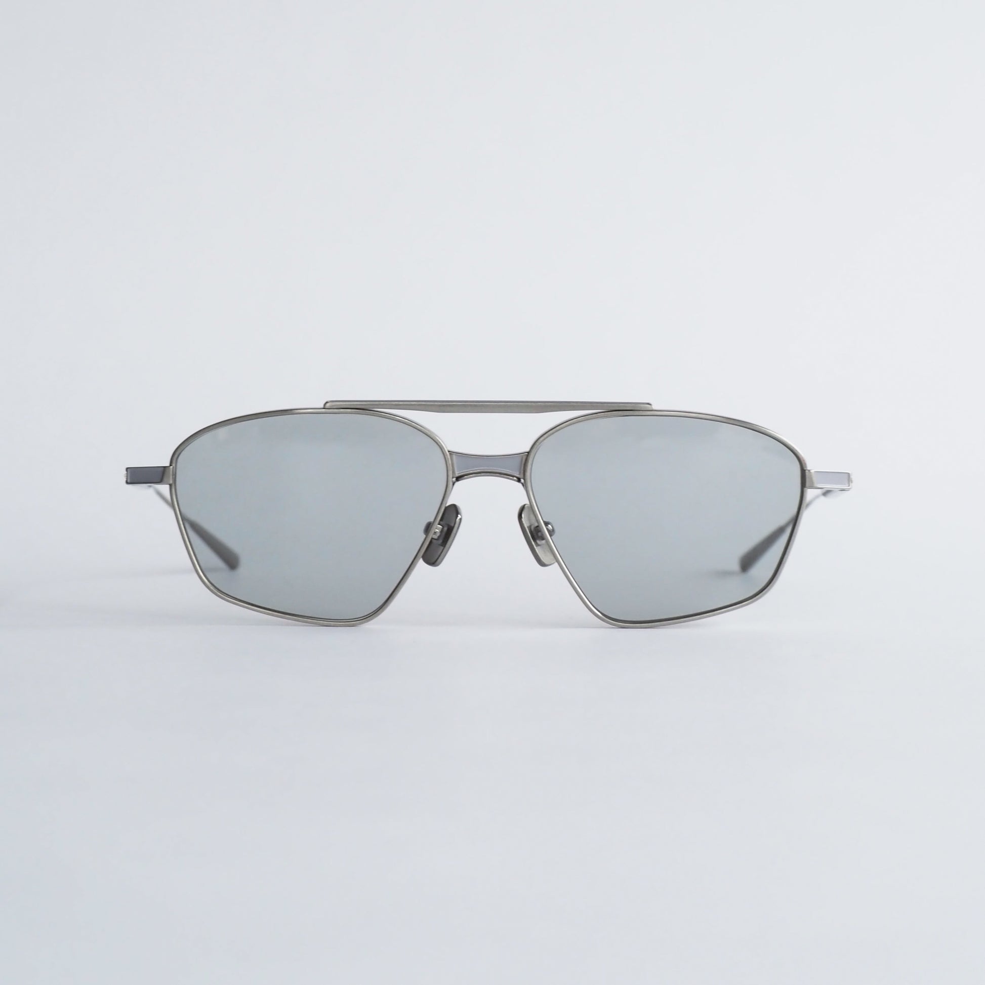 アンティークシルバーのメタルフレームが、顔まわりに静かな存在感をもたらす一本。ダブルブリッジ構造と自由な造形がフロントに明確なラインを描き、強さと繊細さが同居する佇まいです。