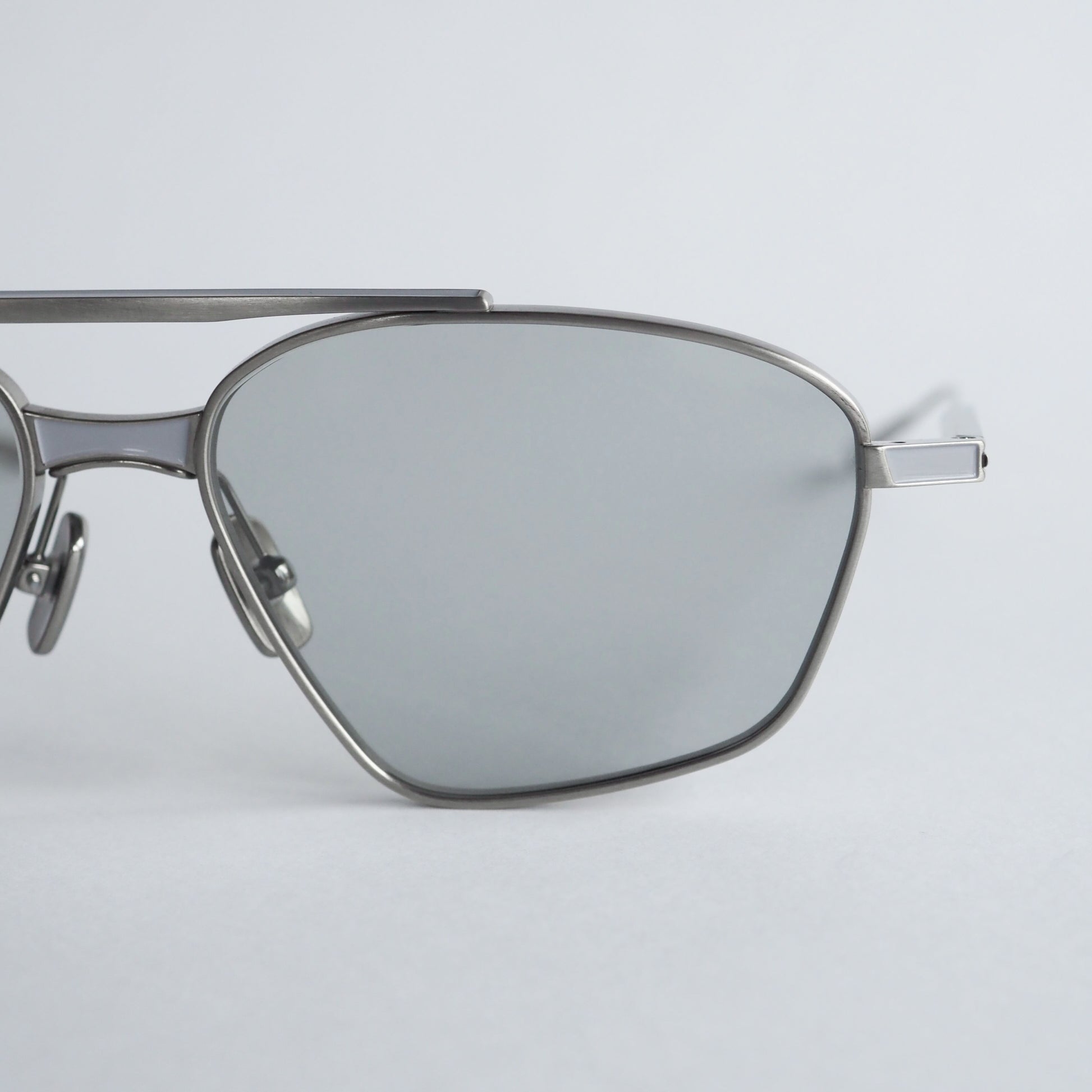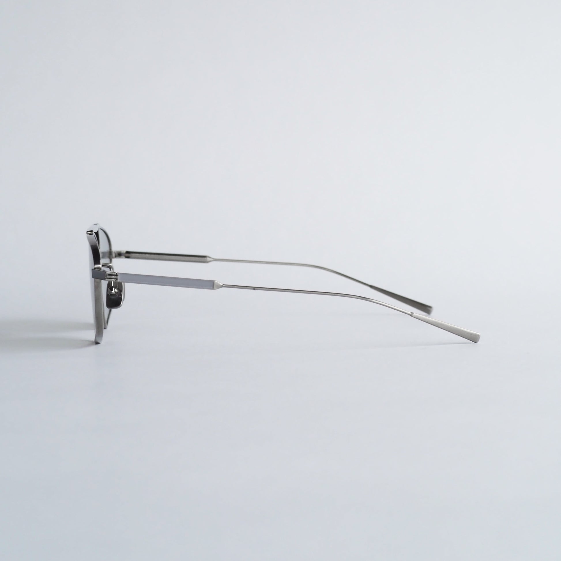 「BOMBARDIER」は絶妙なサイズ設計により、サングラスとしても眼鏡としても使いやすく、スタイルの幅を広げます。ブリッジ・ヨロイ・テンプルといった金属部分に配されたグレーのアクセントカラーが、ただのシルバーフレームに収まらないこだわりを物語ります。