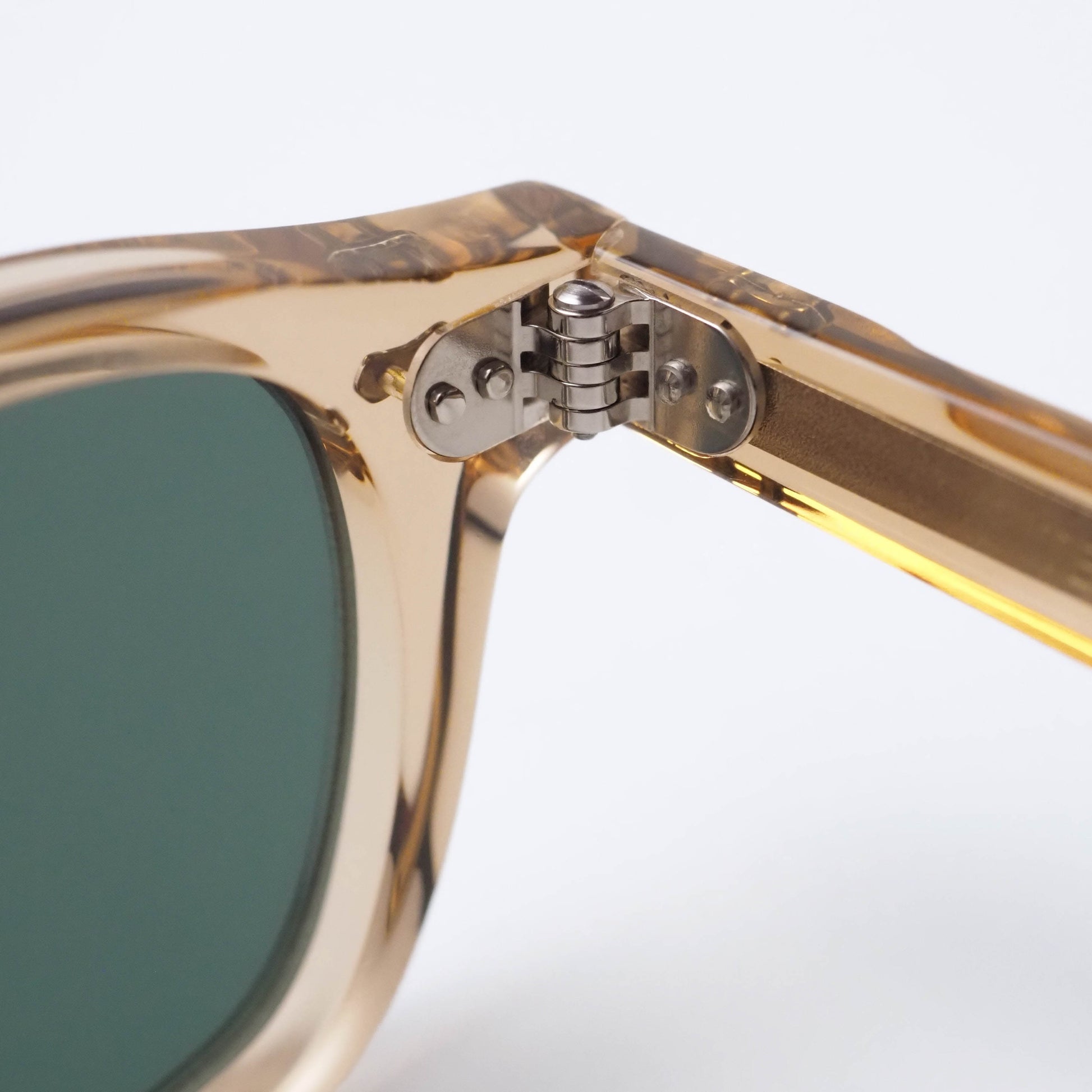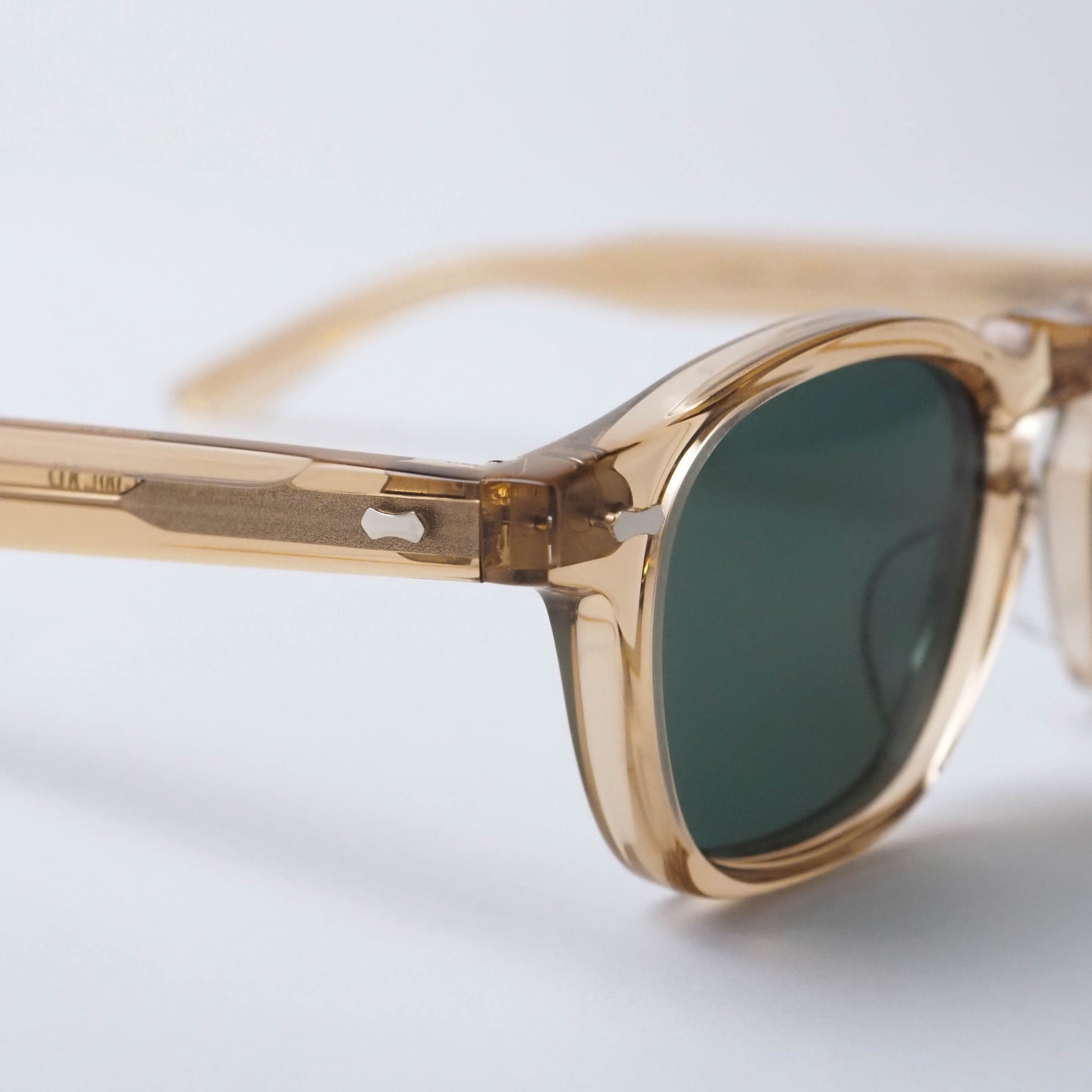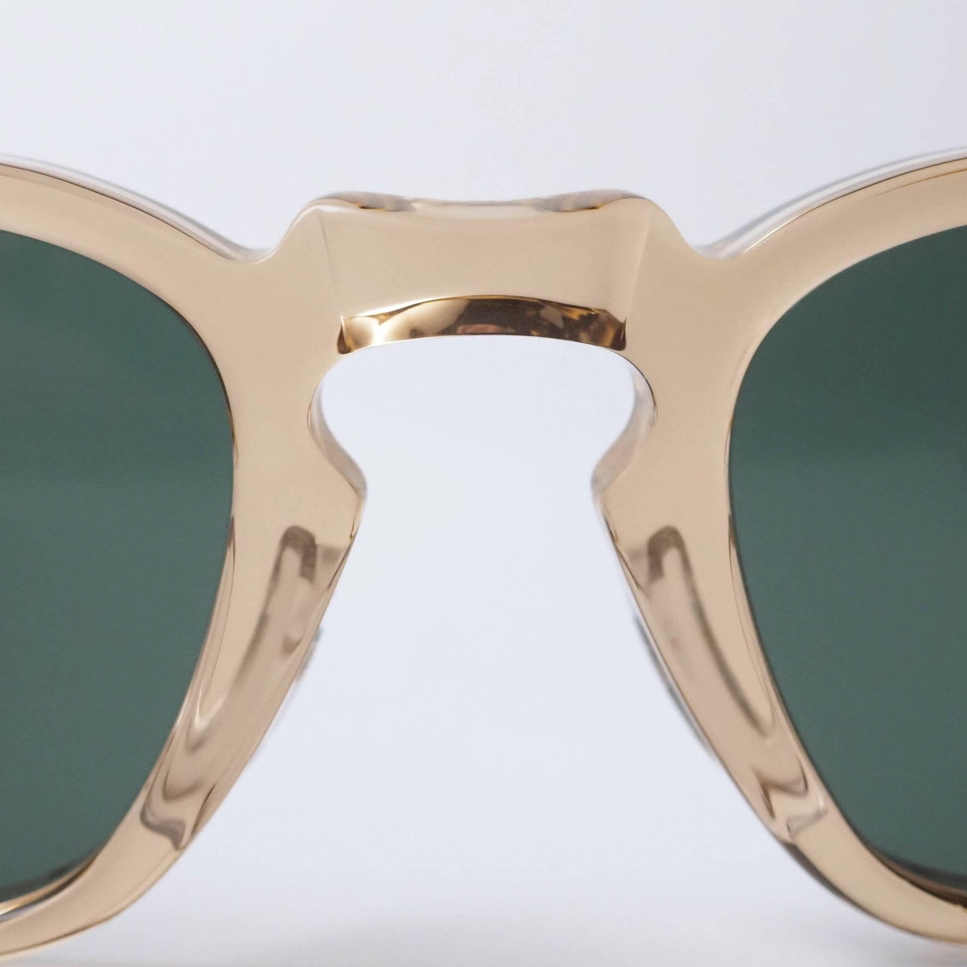 素材には環境負荷に配慮したバイオアセテートを使用。フロントにはほんのりと透明感のあるEco Champagneカラーを採用し、軽やかで上品な印象を演出します。レンズには深みのあるBottle Greenカラーを組み合わせ、自然なコントラストで視界を整えながら、クラシックなサングラスらしい落ち着いた表情を生み出しています。