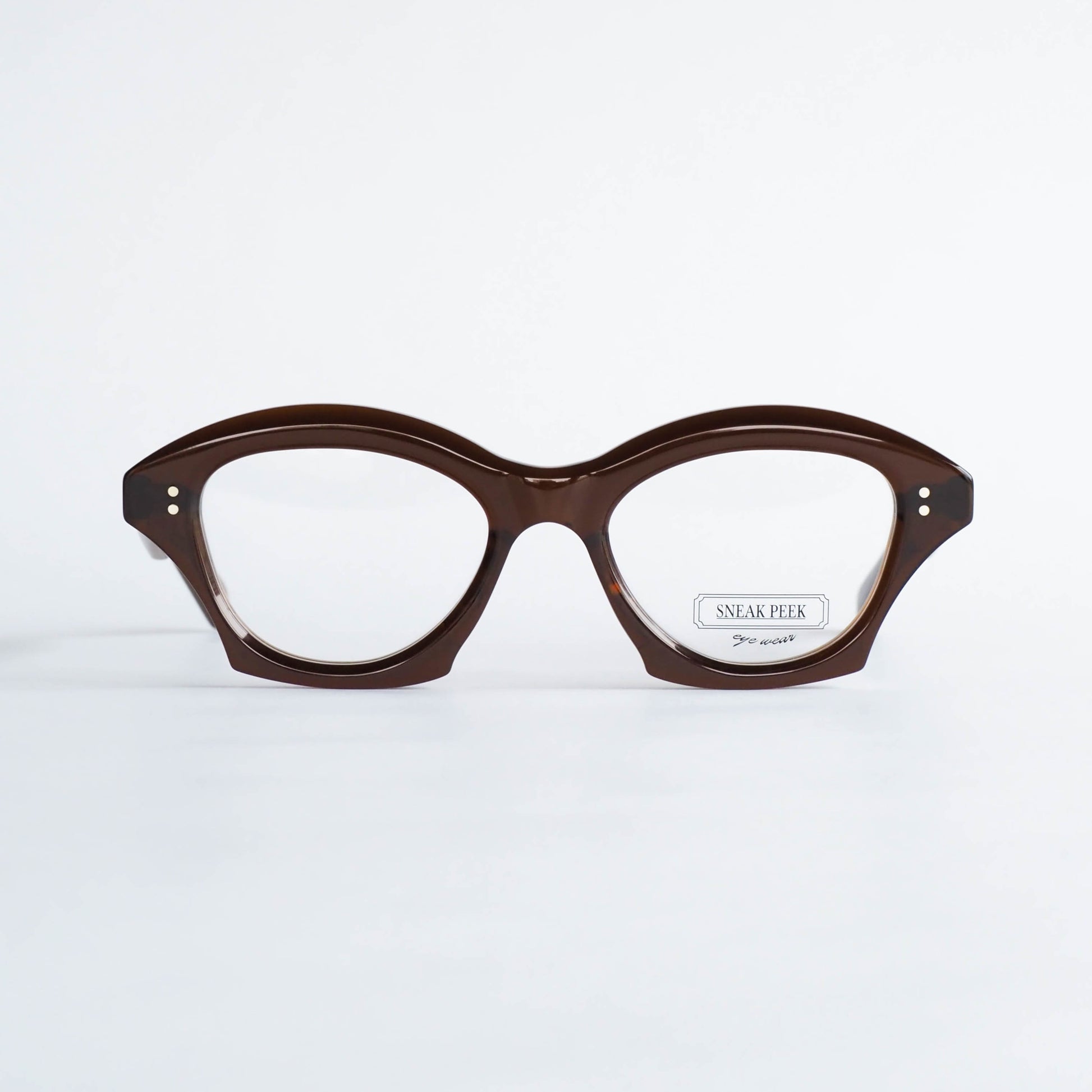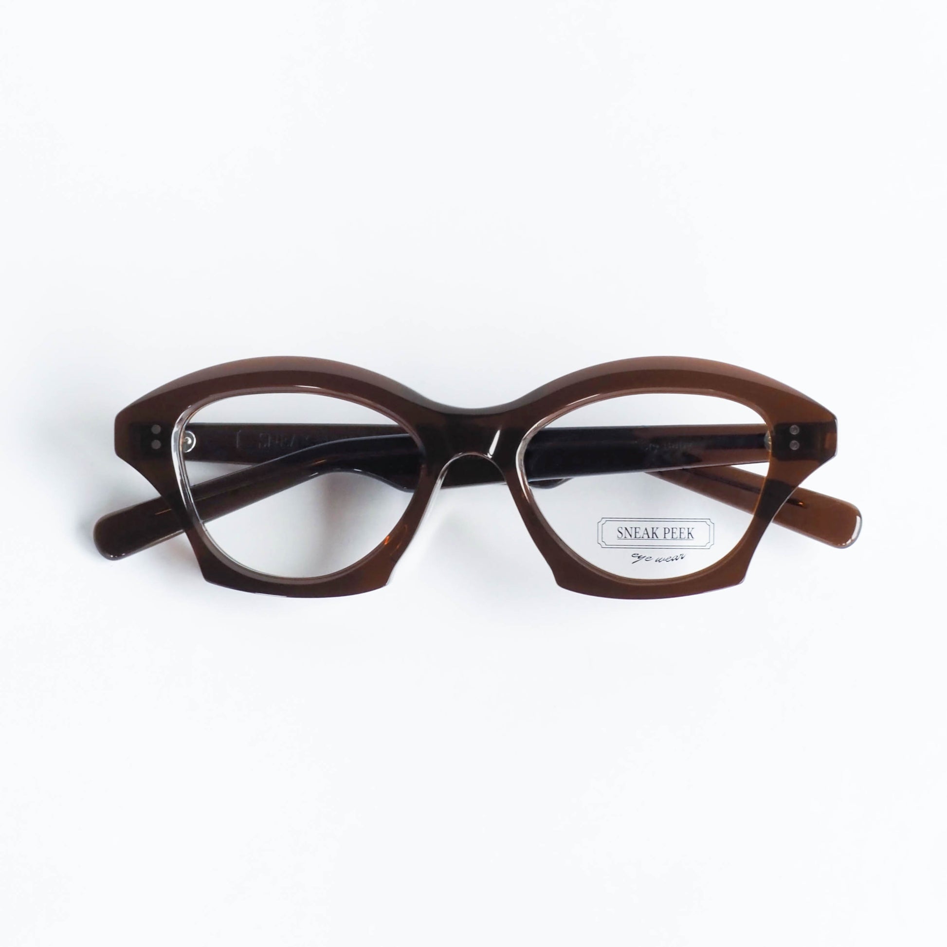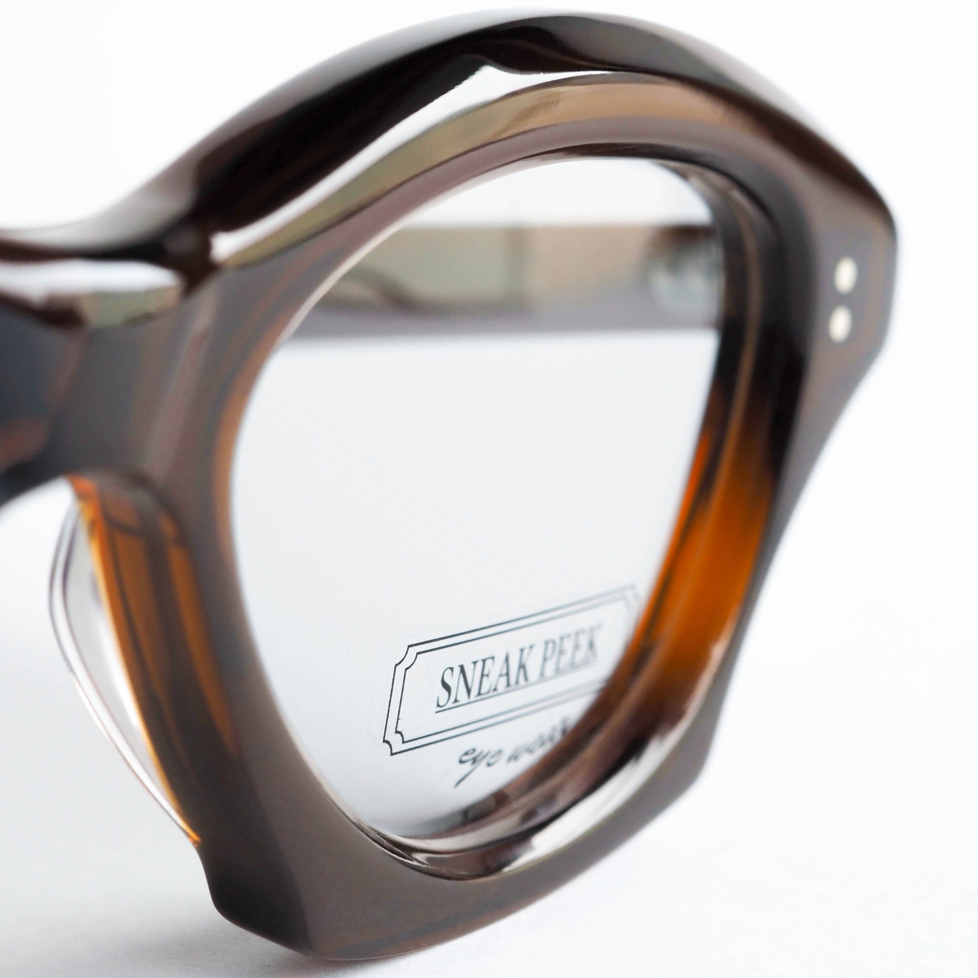 キャットアイ調のフォルムをベースに、リムが内側へえぐれるような独特のカーブを描いた印象的なシェイプ。