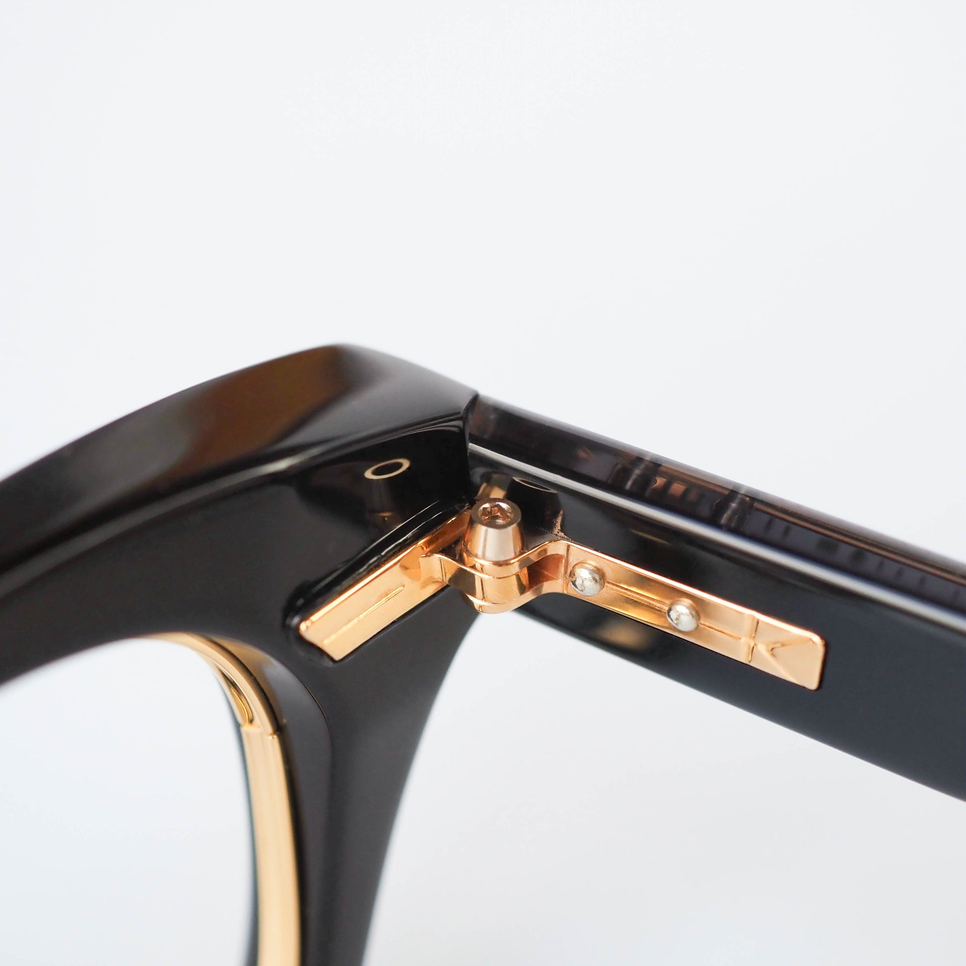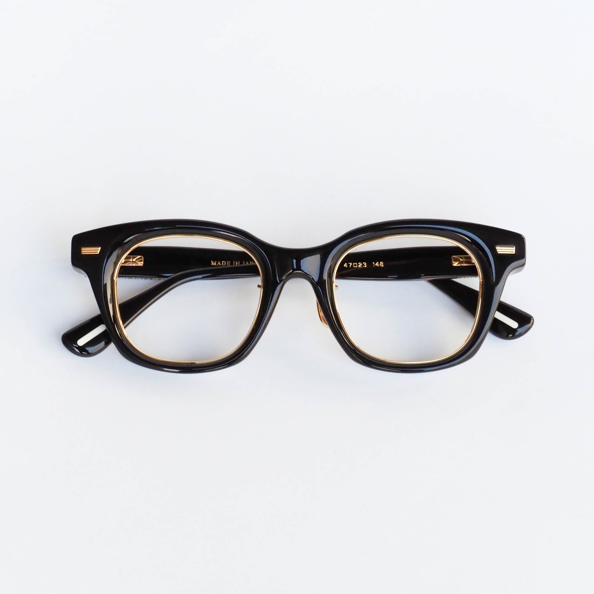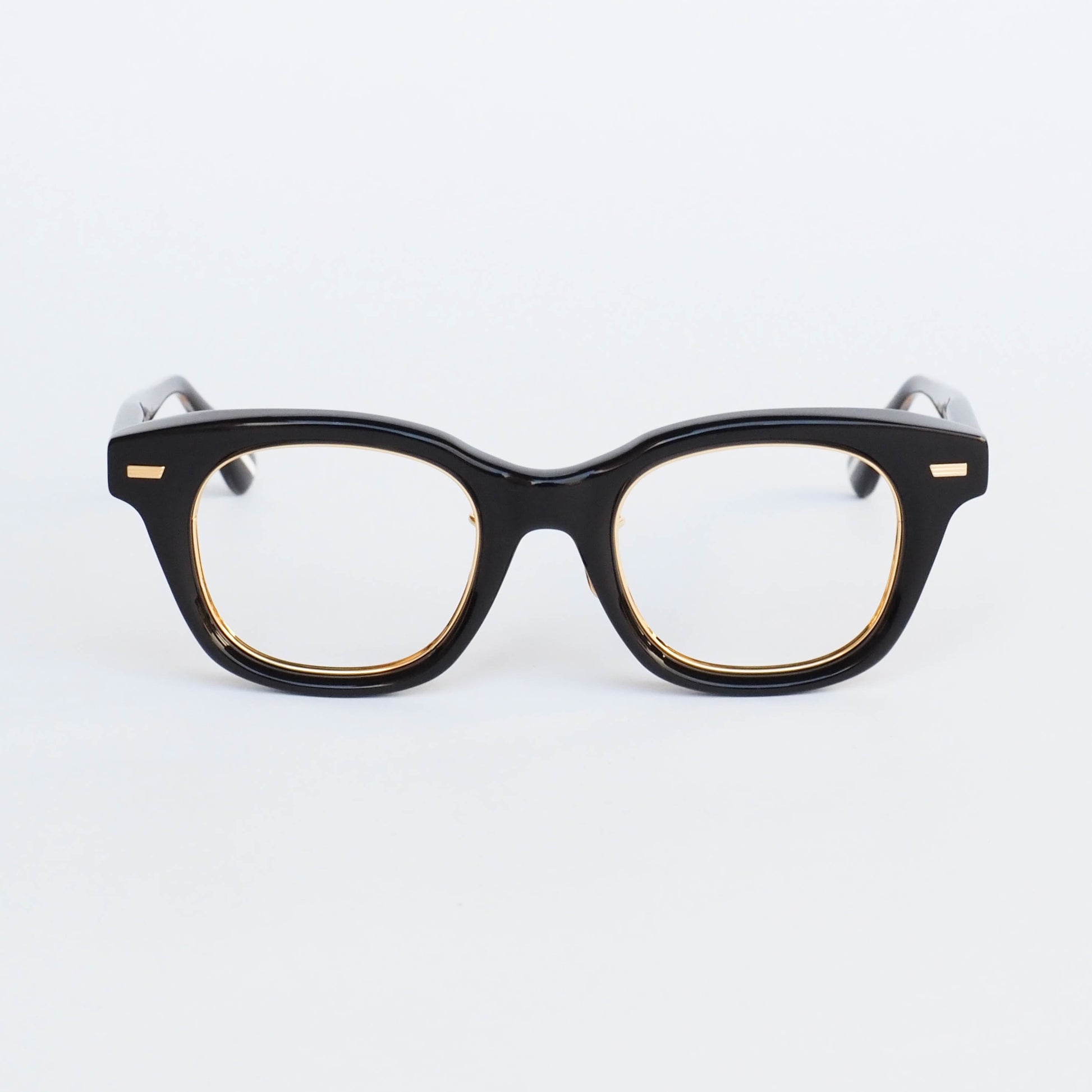 col.01(Black / Gold)は、艶のあるブラックにゴールドのインナーを組み合わせた仕様。正面は引き締まった黒縁の印象でありながら、角度によって内側のゴールドがさりげなく覗き、上品な華やかさを添えます。重厚感と品の良さを兼ね備えた一本です。