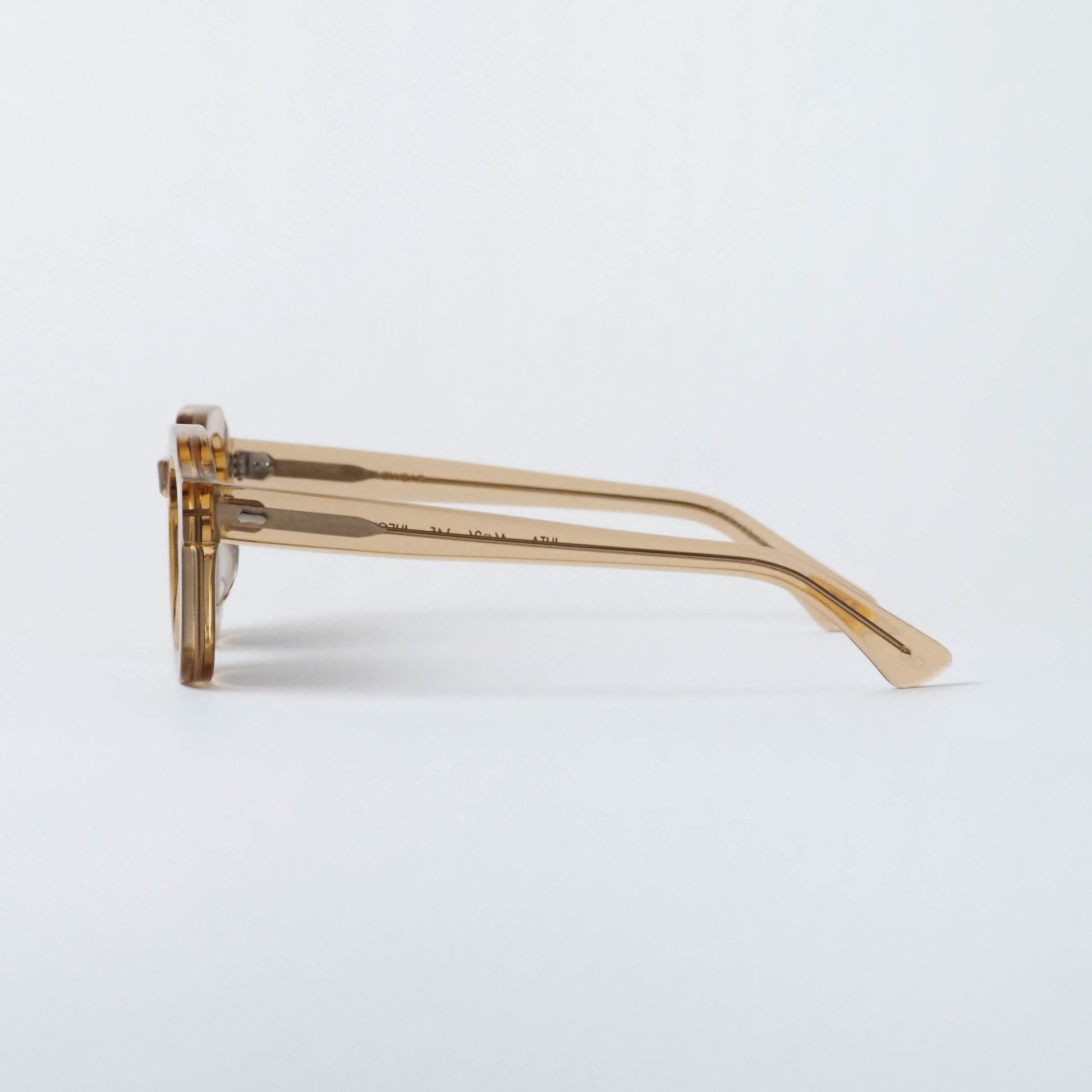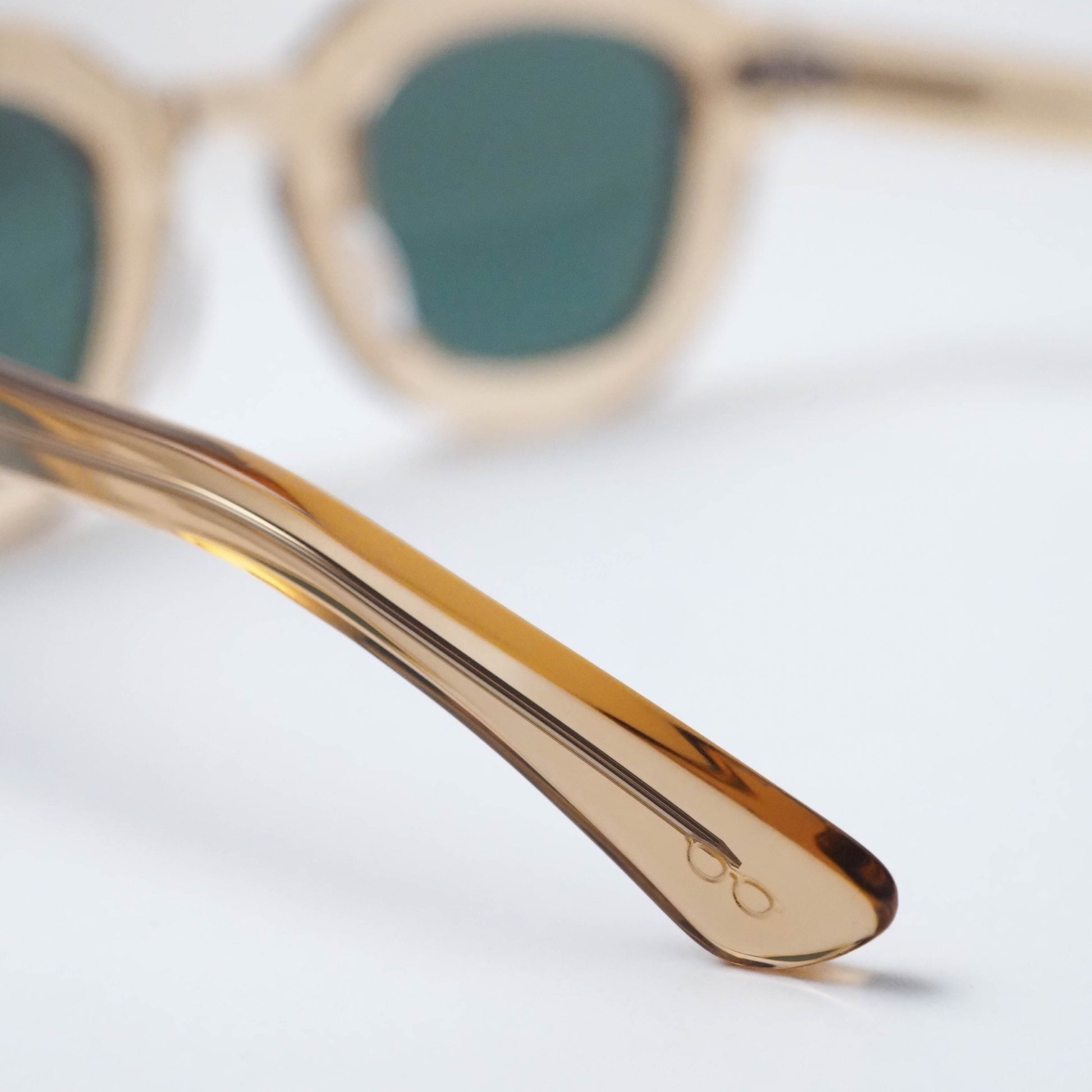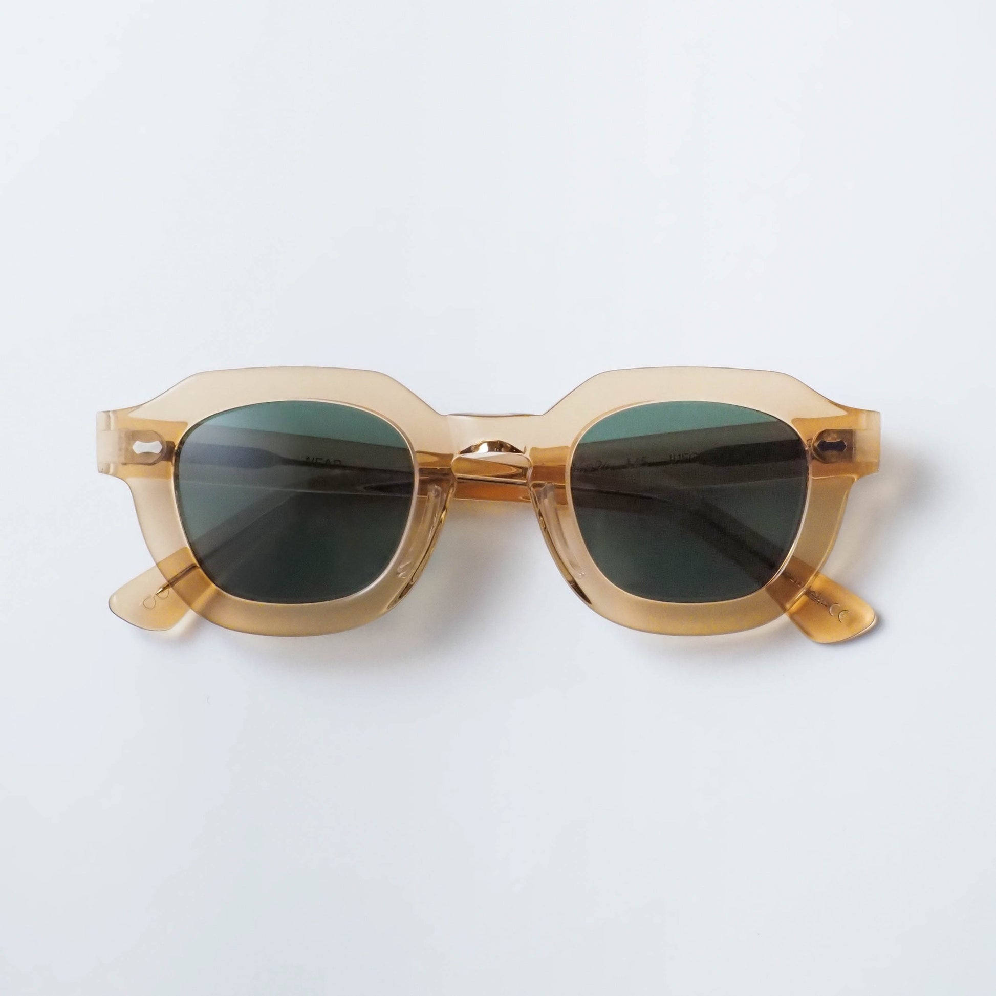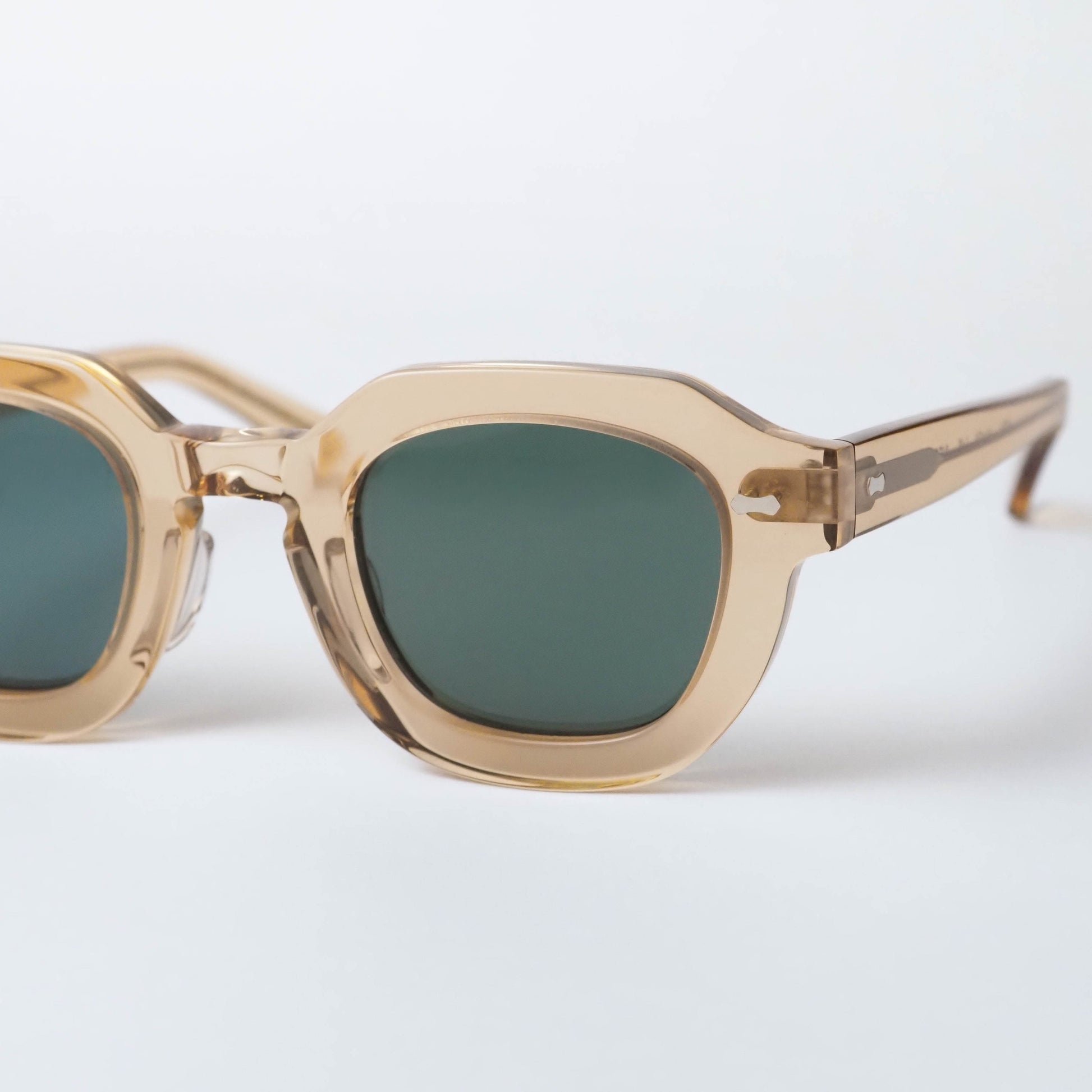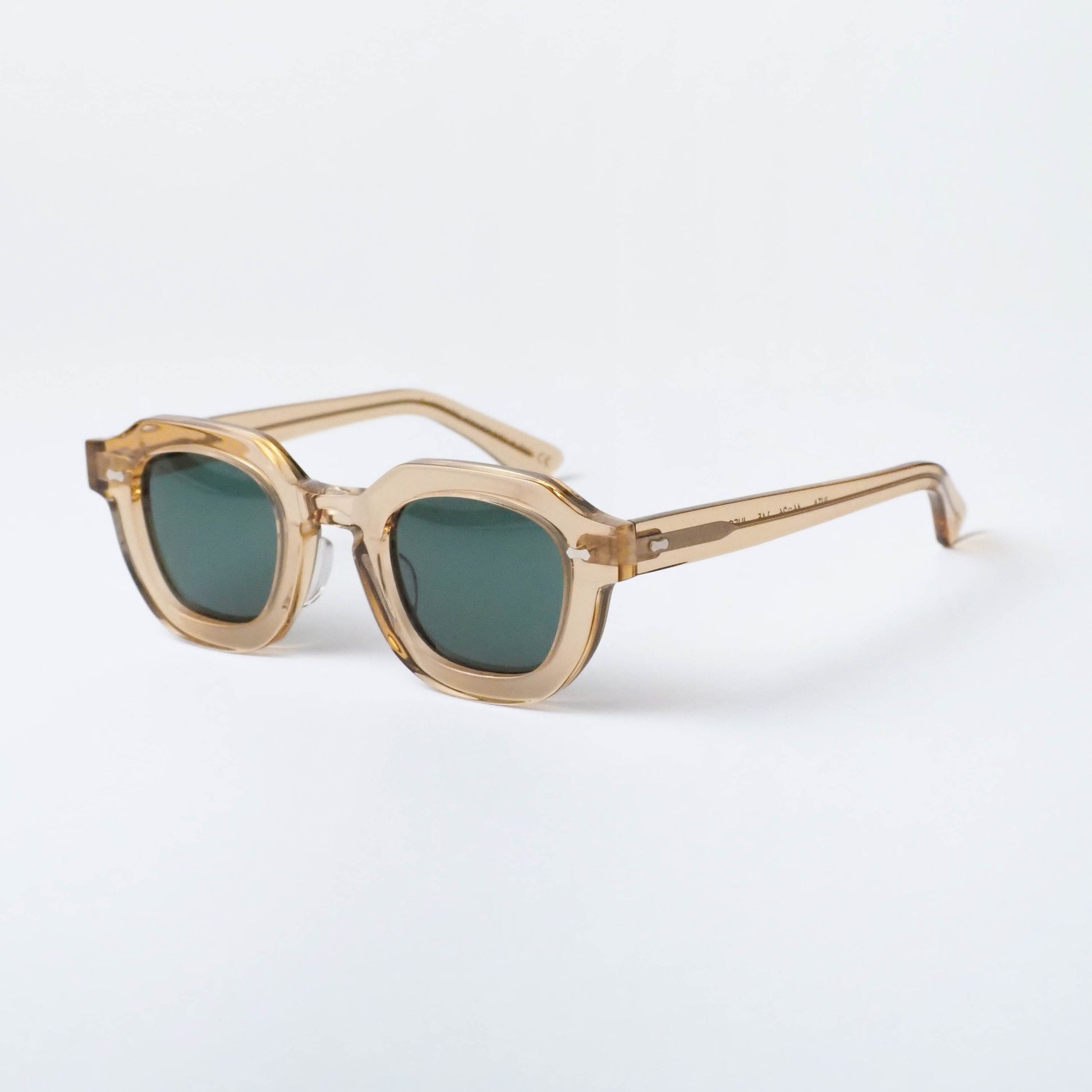 フレームには、ほんのりと透明感を帯びたシャンパンカラーのバイオアセテートを採用。軽やかで上品な色合いが、顔まわりに柔らかな印象を与えます。レンズには深みのあるボトルグリーンカラーを組み合わせ、落ち着きのあるコントラストが洗練された表情を演出します。