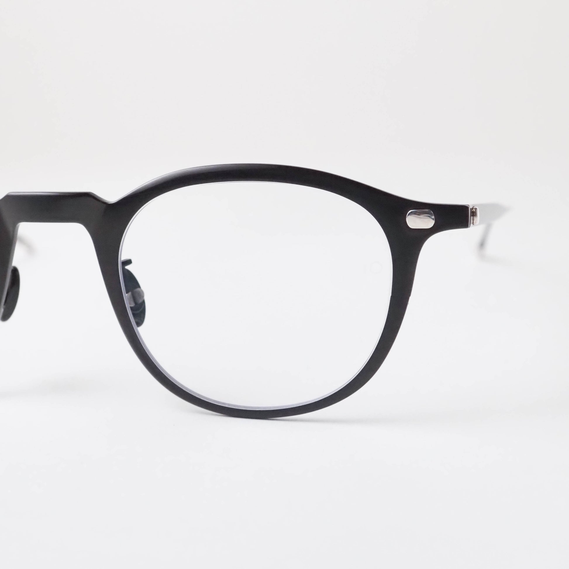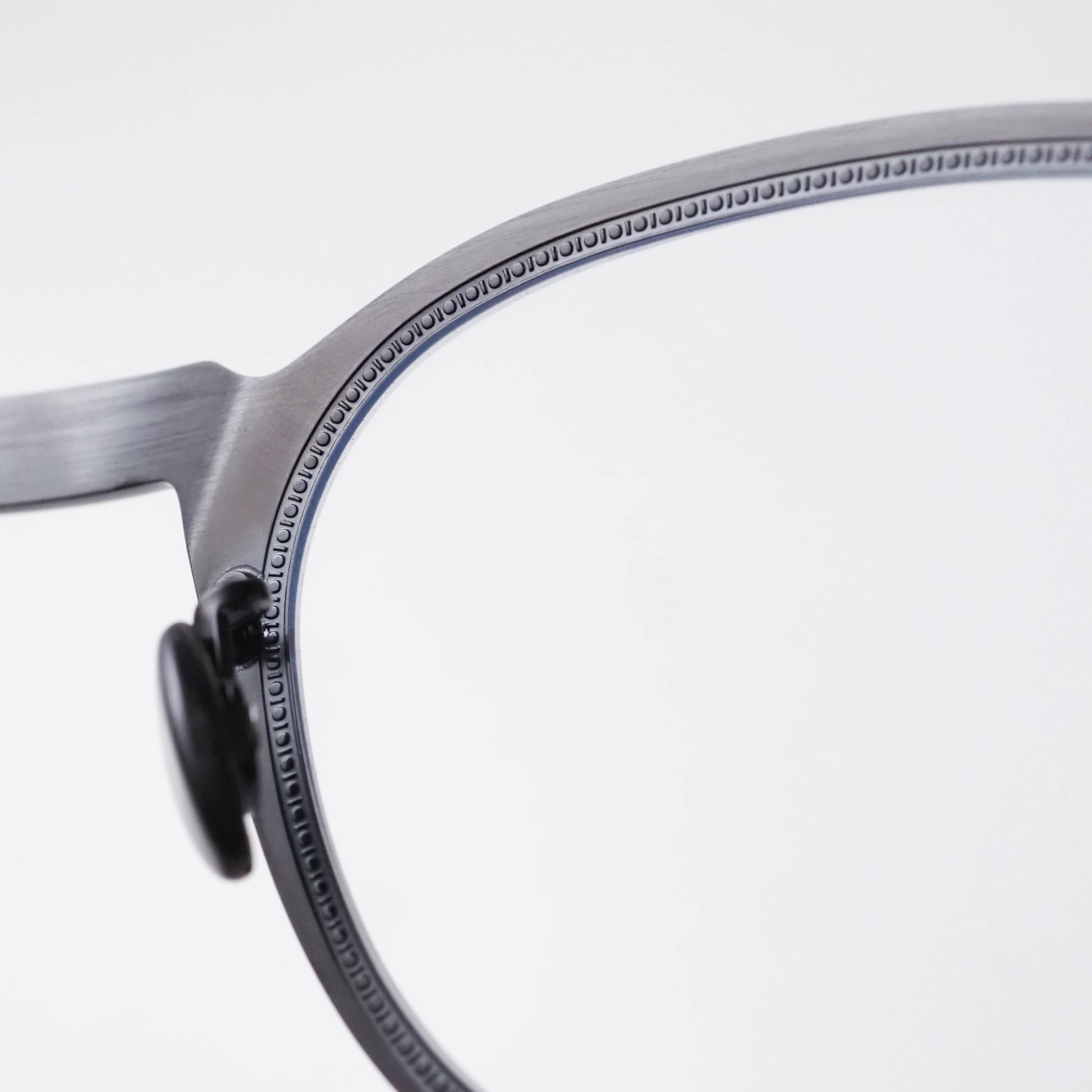 鼻パッドには天然素材である“蝶貝”を使用したシェルパッドを採用。光の当たり方によって輝き、金属の質感の中に繊細な表情を添えます。素材のコントラストが、静かな高級感をさりげなく演出しています。