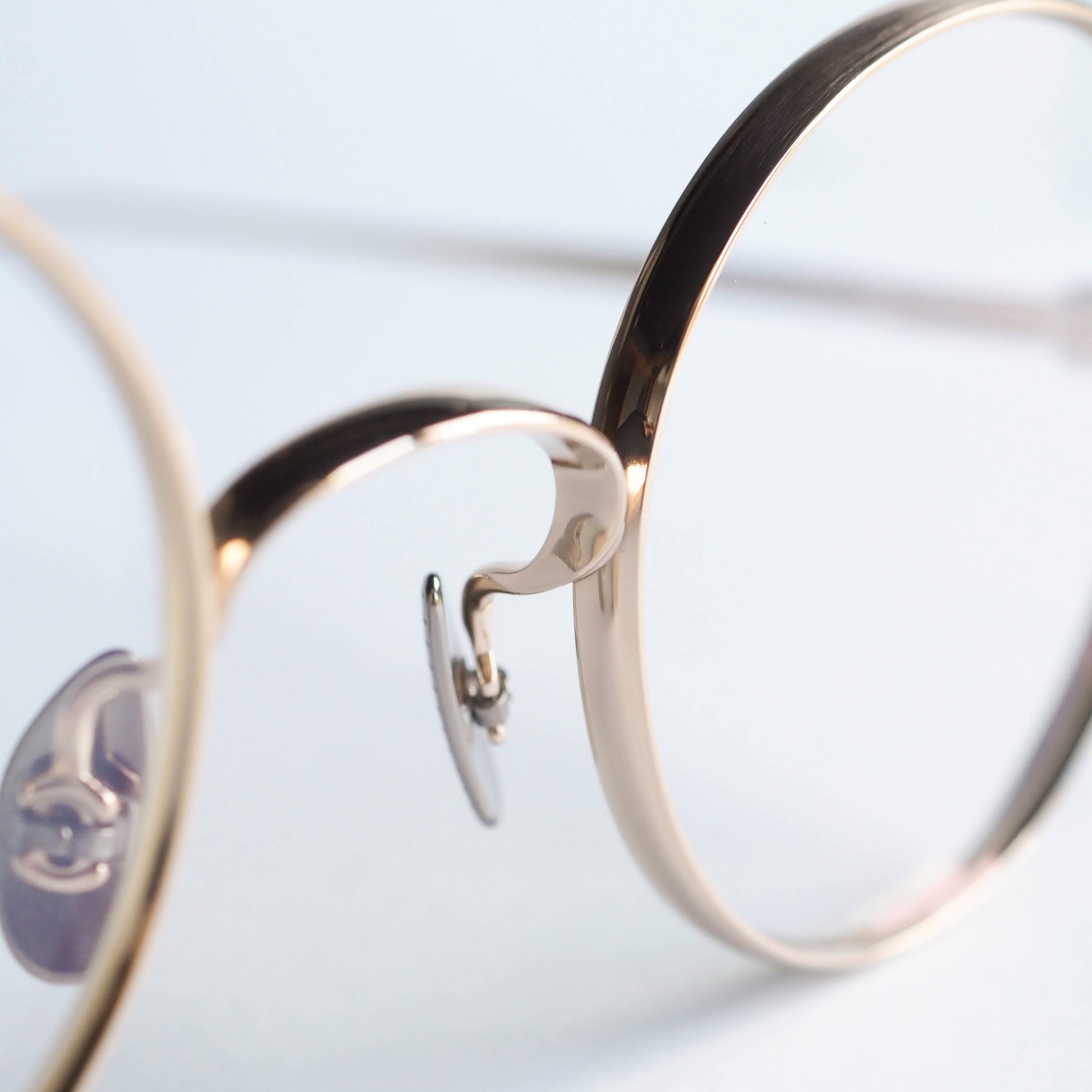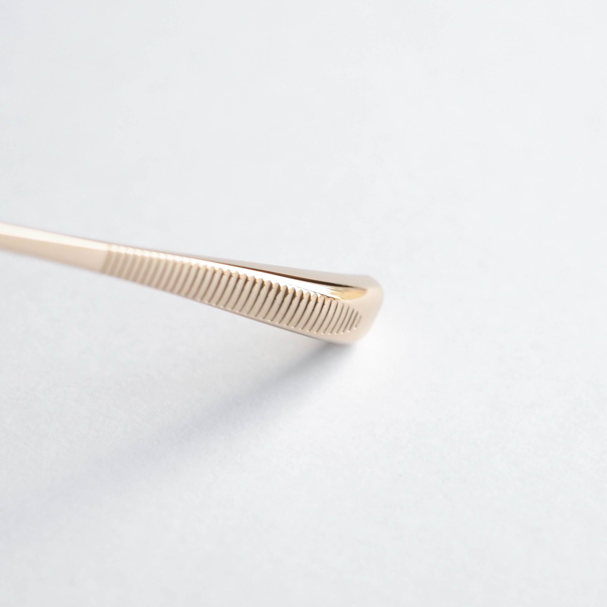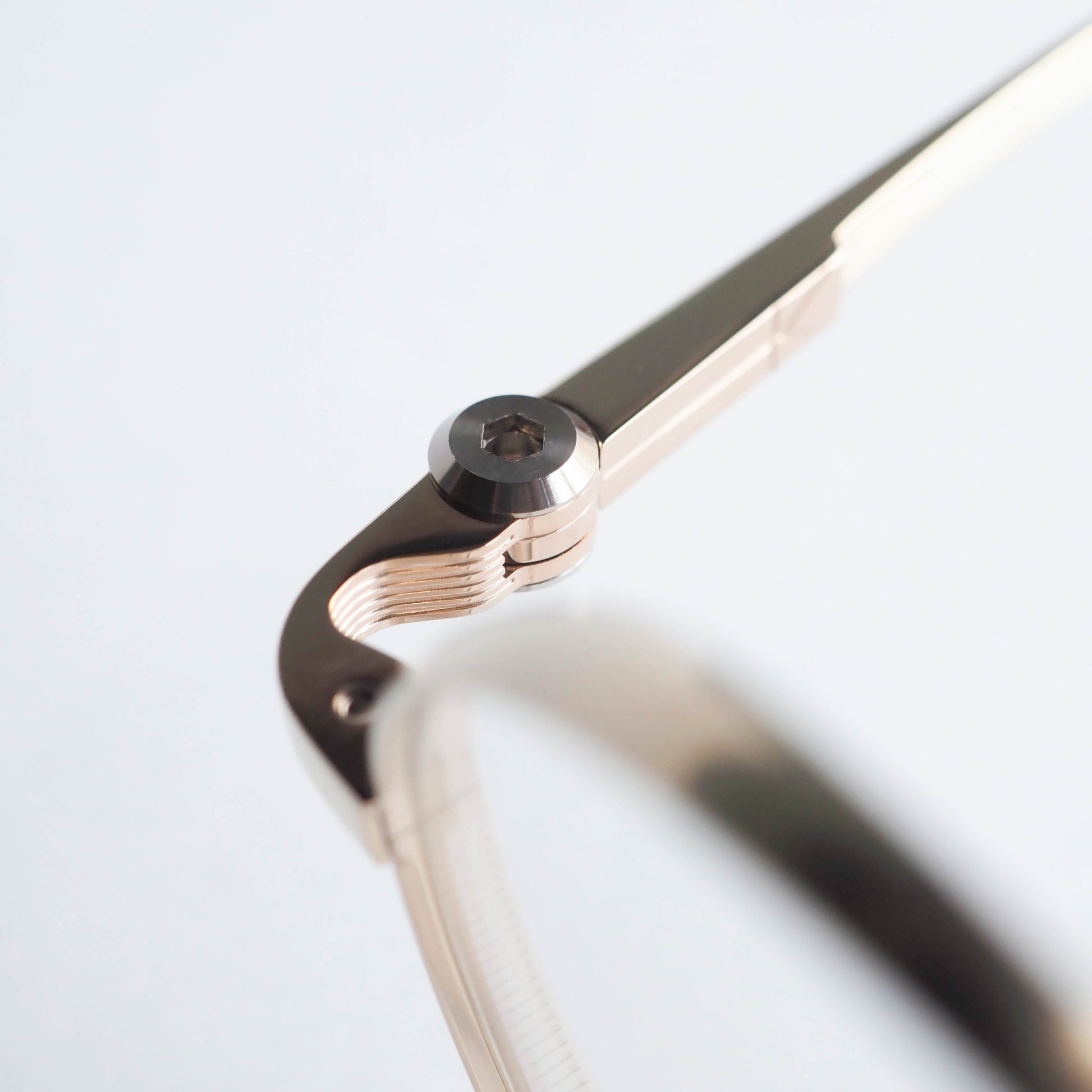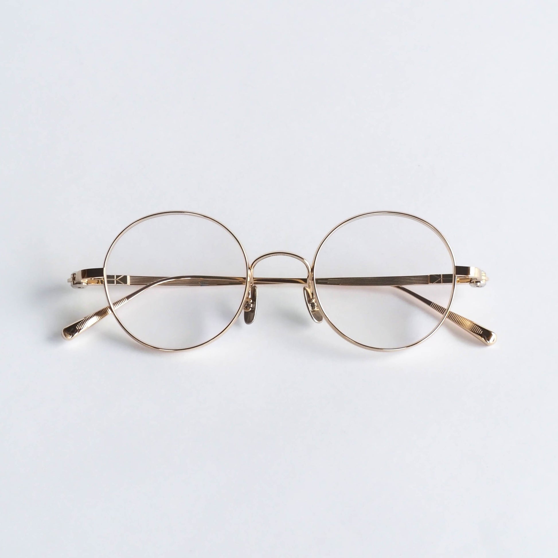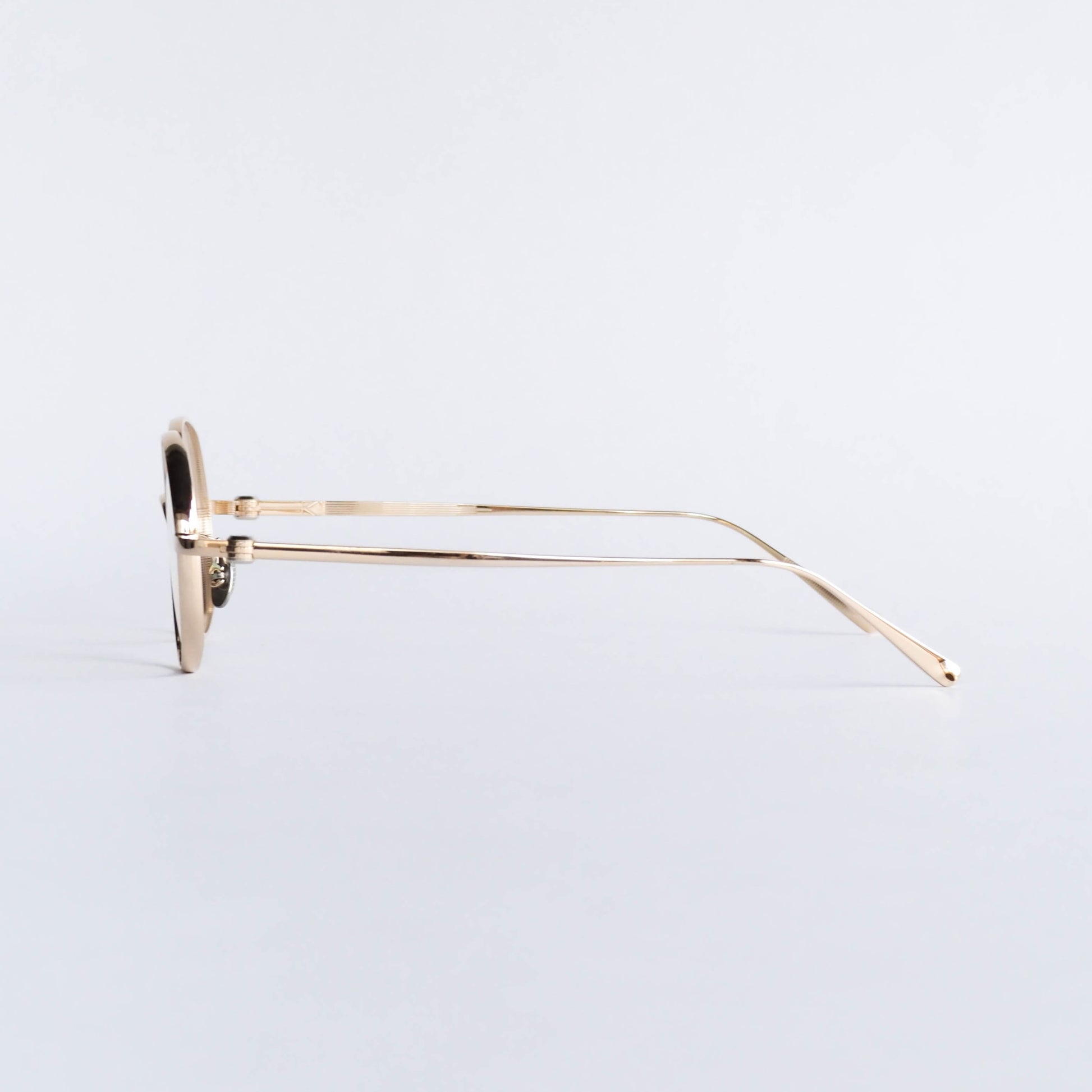 リムとブリッジは、甲丸で奥行きのあるフード形状に設計。正面から見ると非常に細く繊細なラインを描きますが、サイドには程よい厚みを持たせています。この立体的な構造により、軽やかさと存在感を無理なく両立しています。