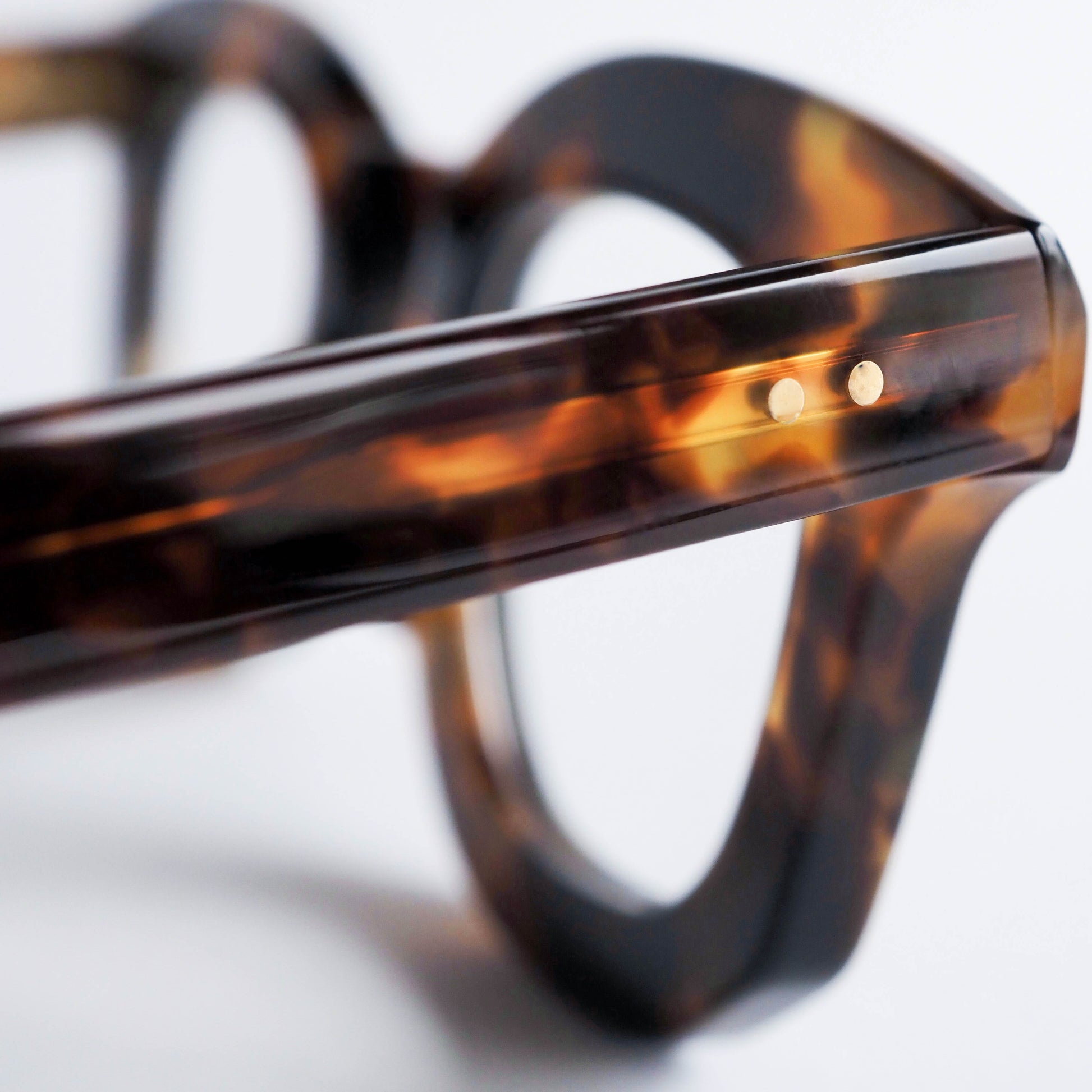 べっこう柄のアセテートが、力強いフレームラインに奥行きと柔らかさを与え、クラシックで落ち着きのある表情を演出しています。重厚さの中に品の良さが感じられる、完成度の高いカラーリングです。