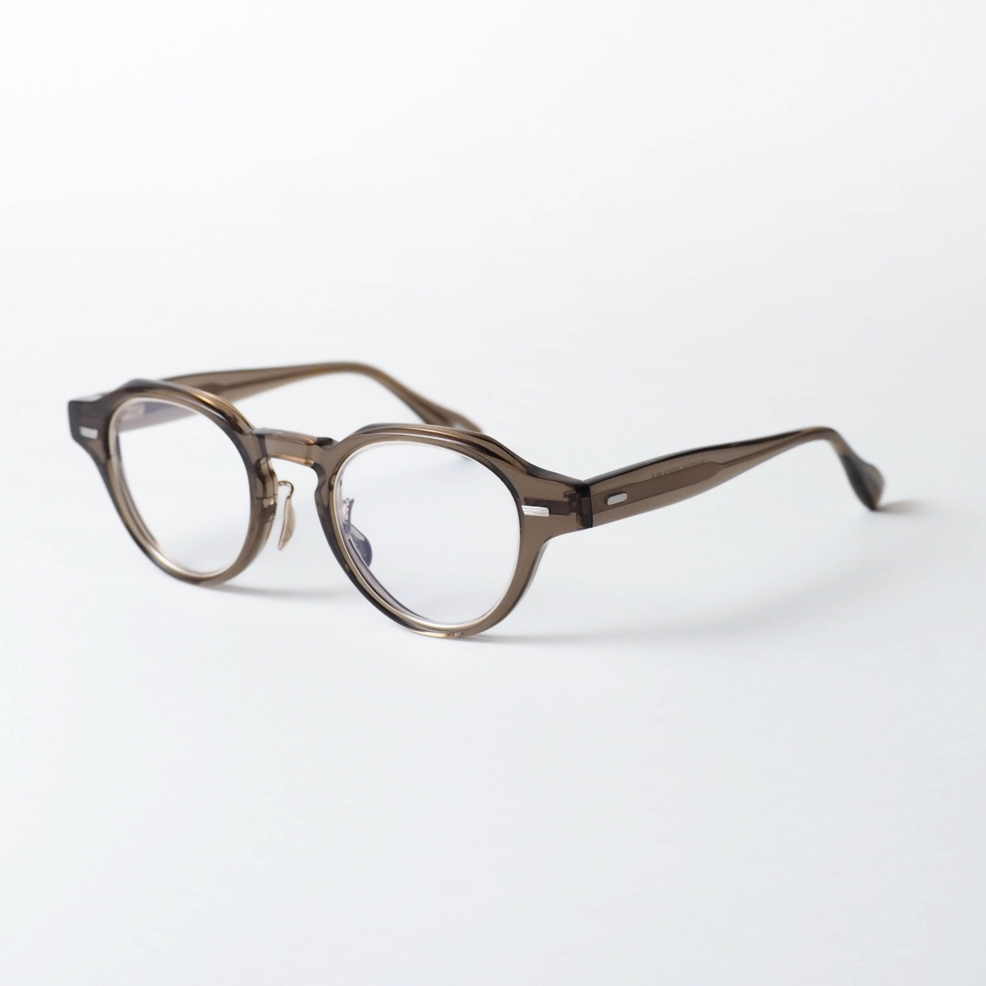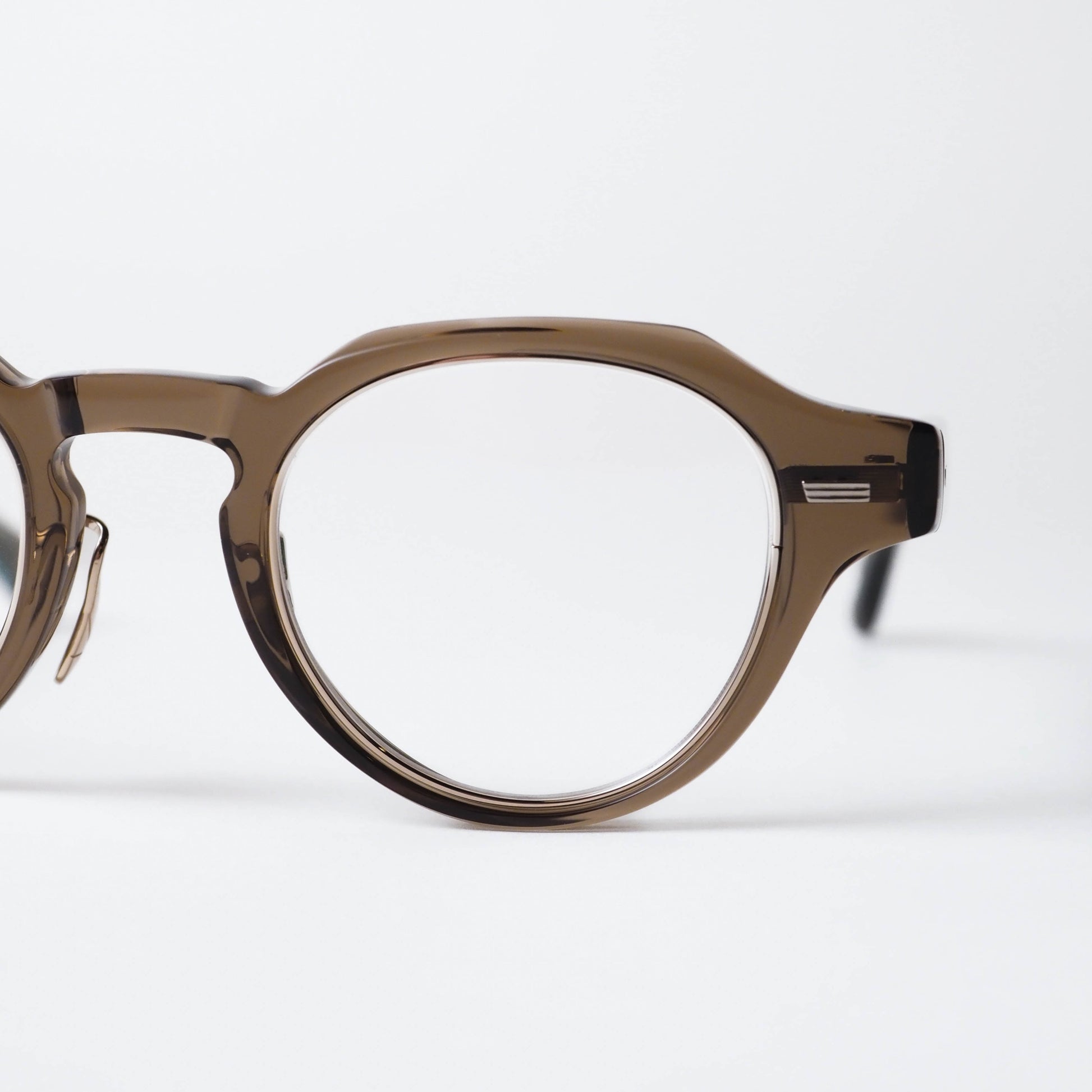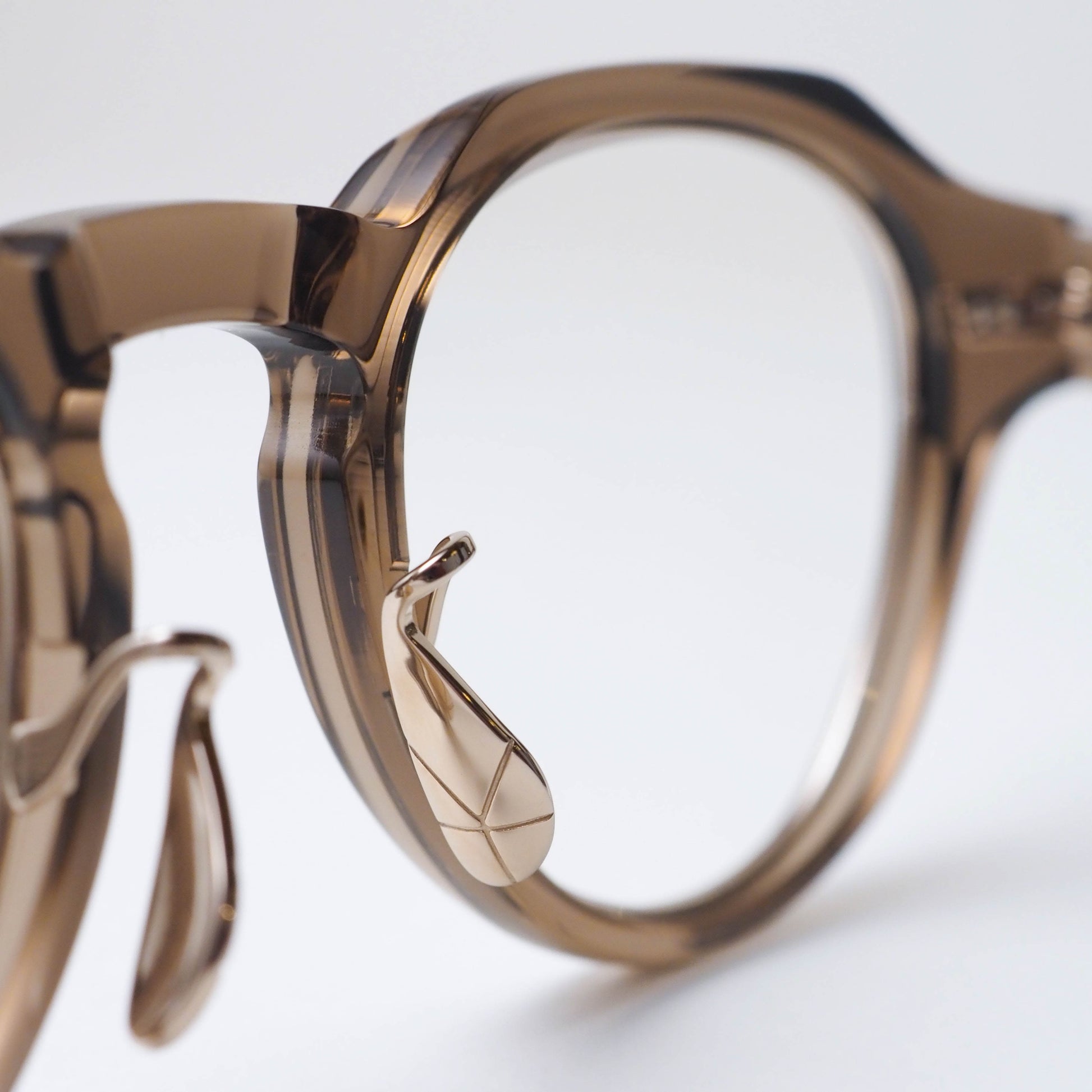 col.03は、透明感のあるクリアブラウンのセルフロントに、ホワイトゴールドのメタルパーツを組み合わせたカラーリング。