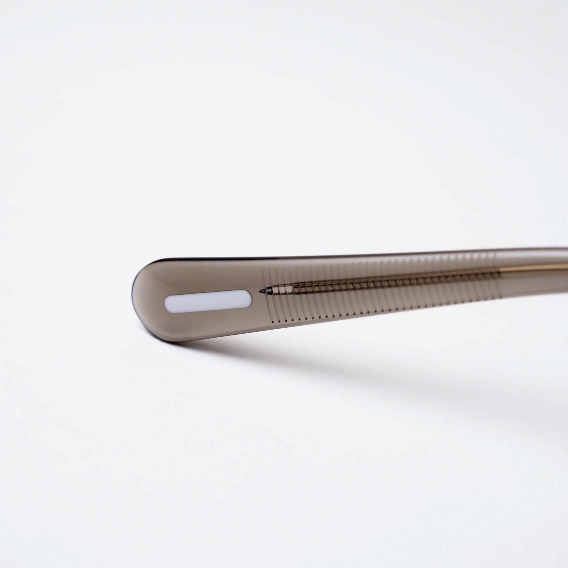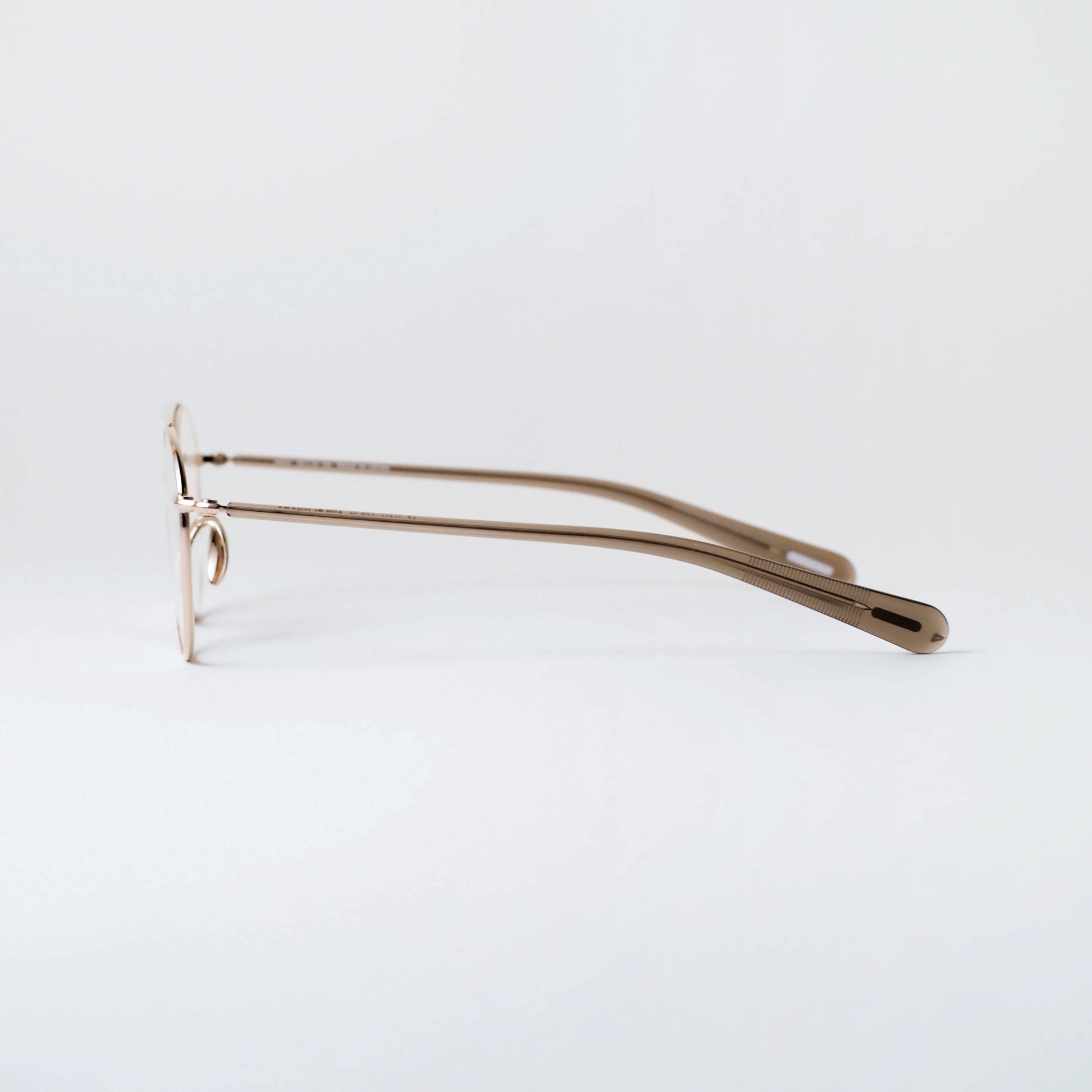 テンプルにはクリアベージュ系カラーのセル巻きを組み合わせ、金属の緊張感に温度感と透明感を添えています。