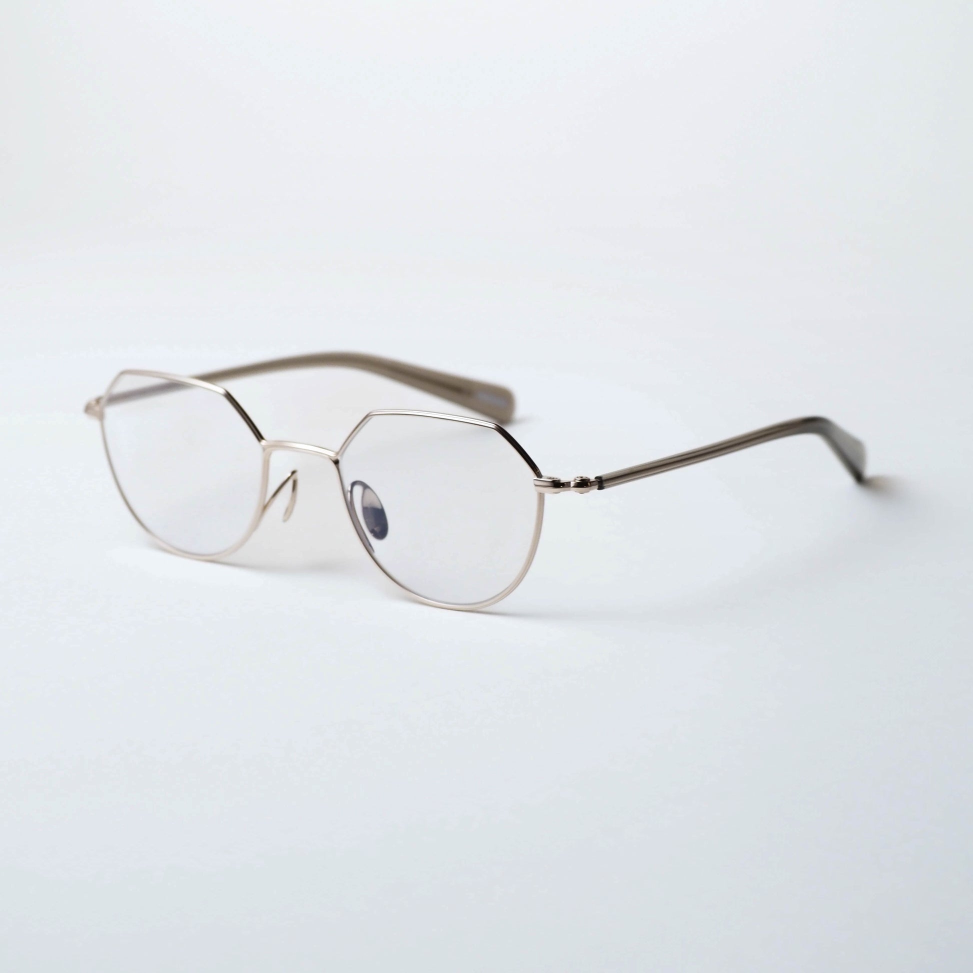 col.01(White gold / Taupe)は、ホワイトゴールドカラーのメタルフレームをベースに、クリアベージュ系カラーのセル巻きテンプルを組み合わせた仕様。
