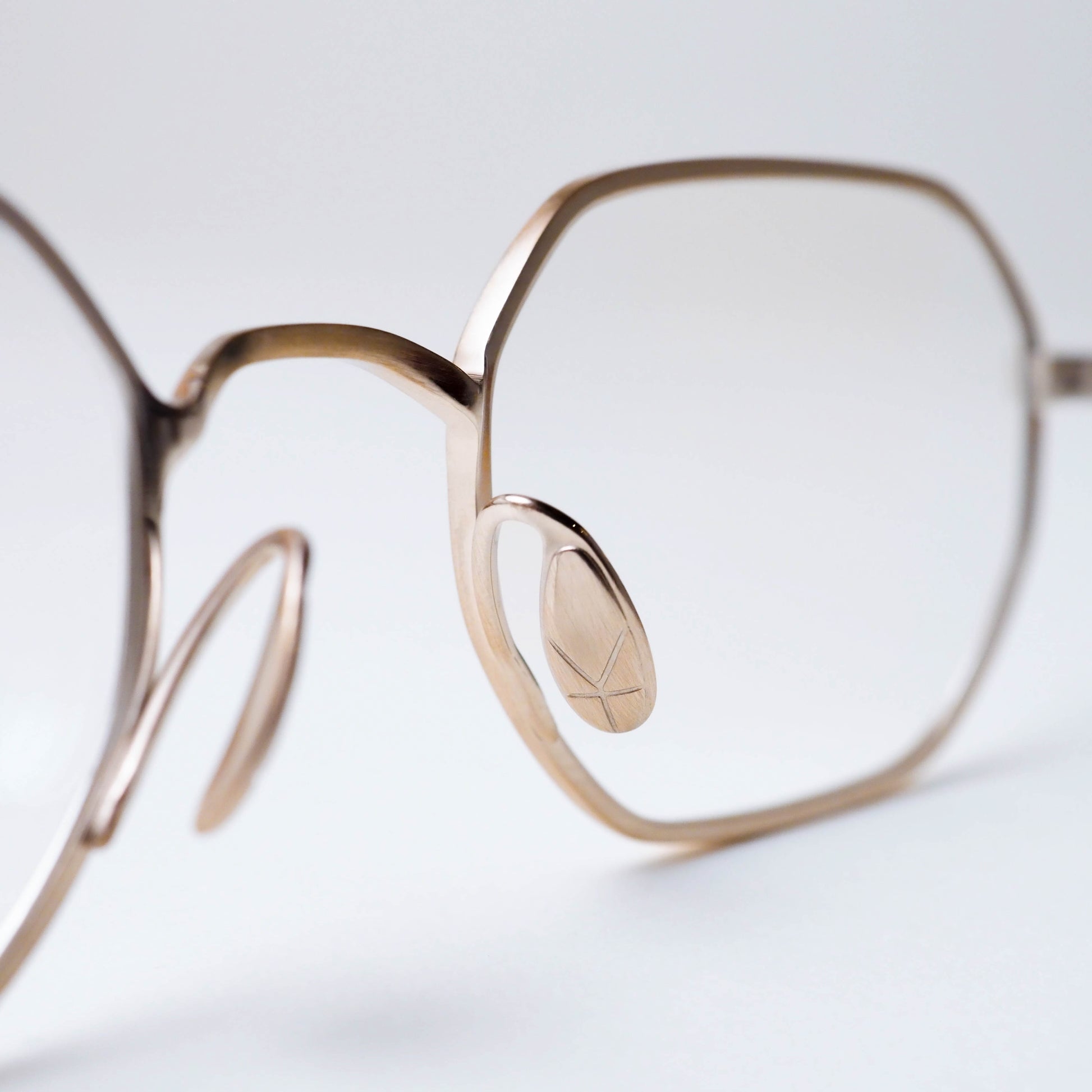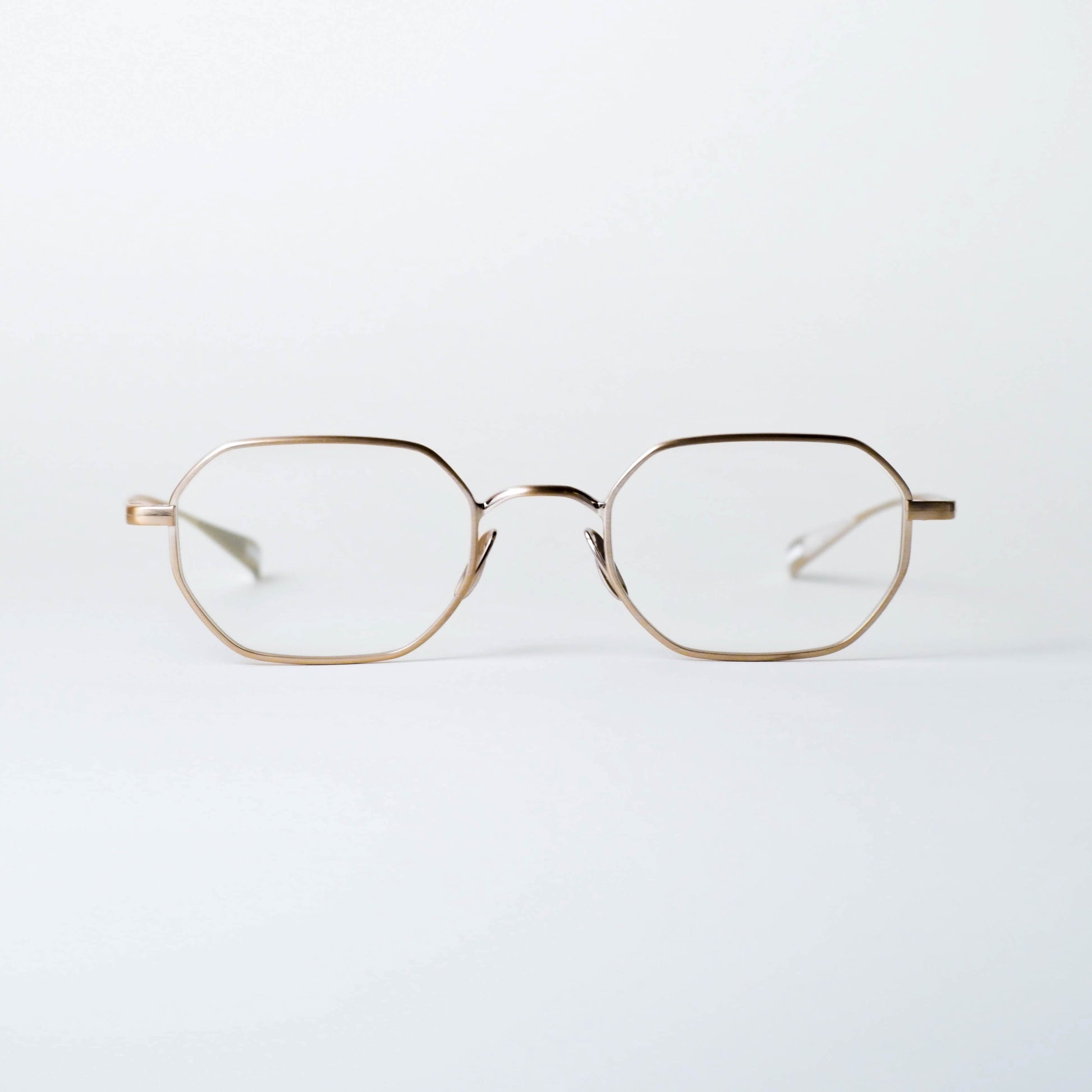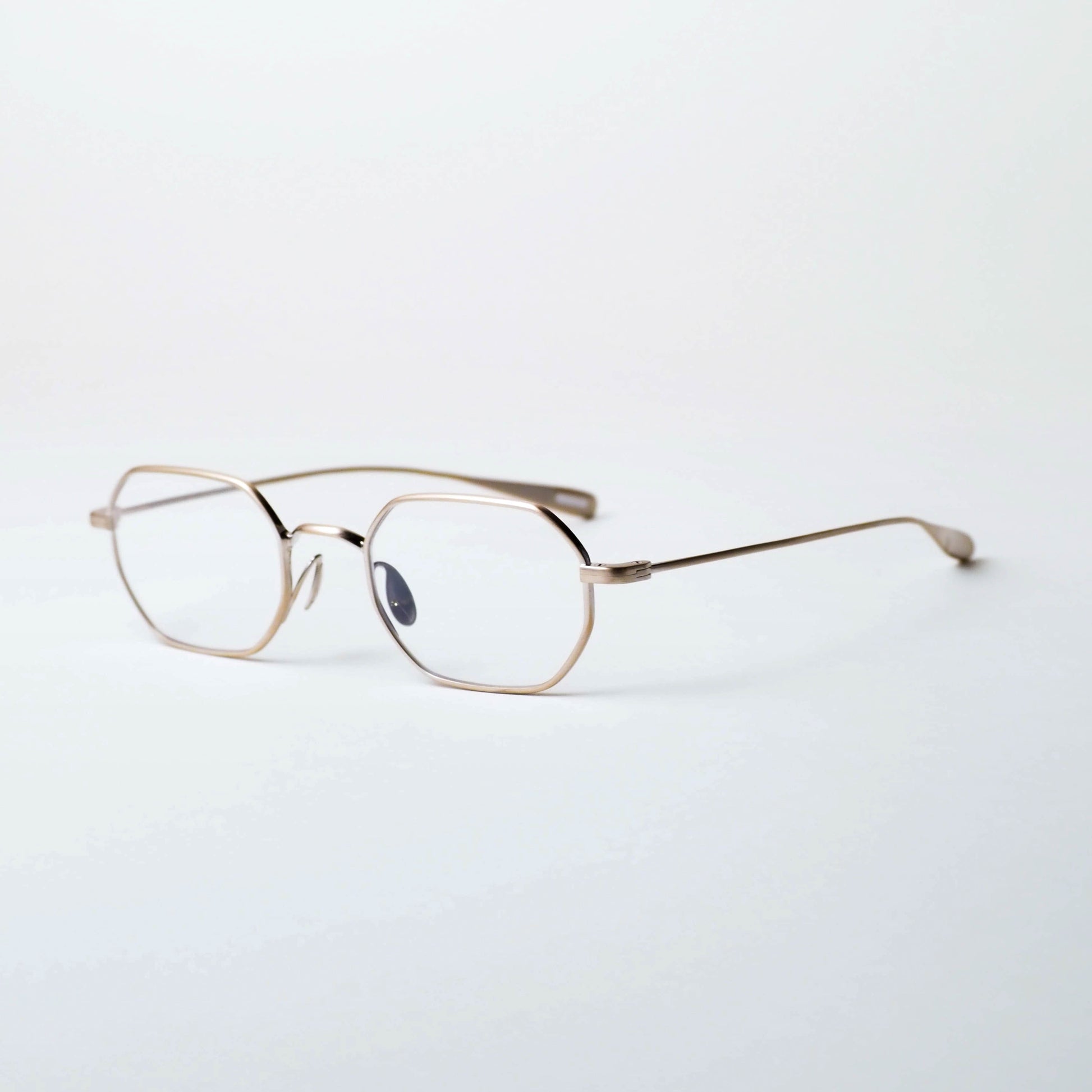 現在のアイウェアトレンドとして注目されるスクエアシェイプをベースに、メタルフレーム特有のシャープさを備えつつ、線の太さや角度に微細な調整を施すことで、掛けた際には硬さを感じさせない、穏やかな表情に仕上げられています。