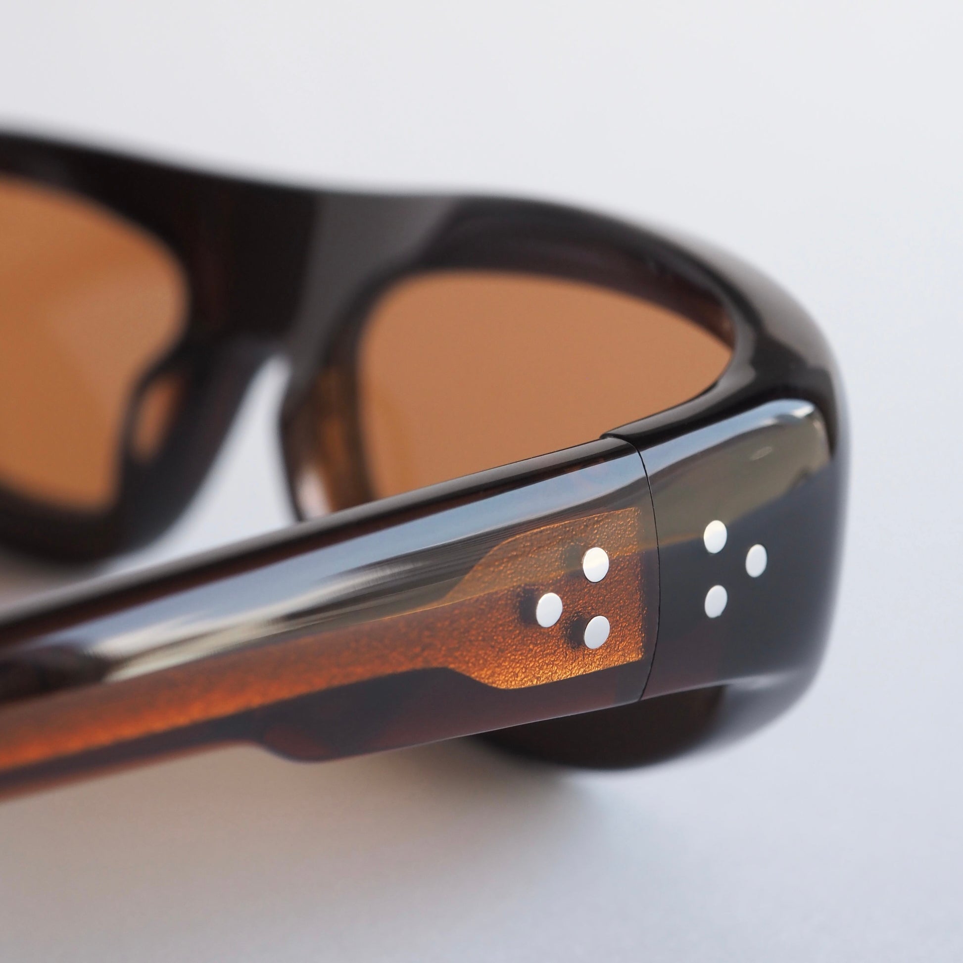 テンプルに配された6つのドットリベットが、ミニマルな中に遊び心を添えています。