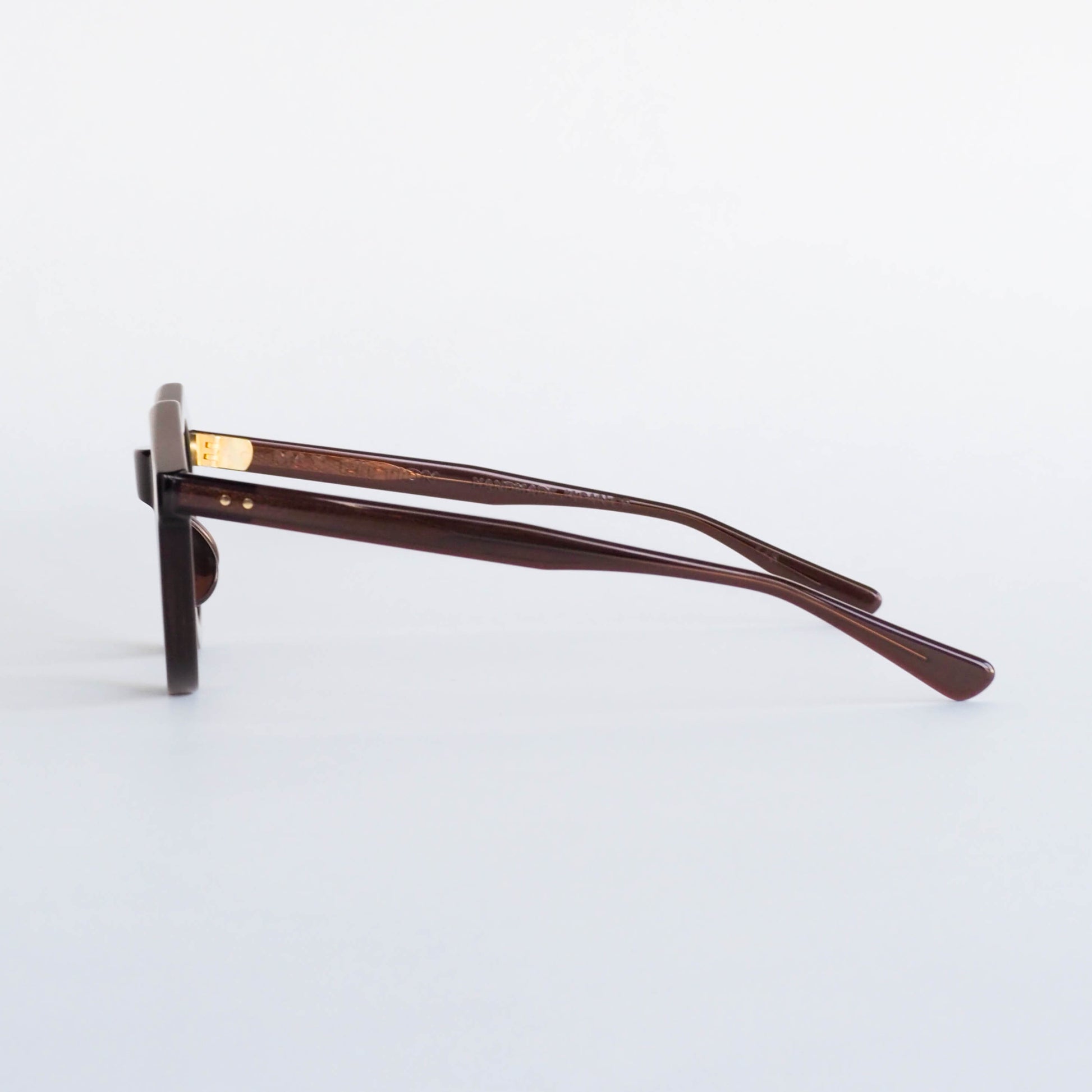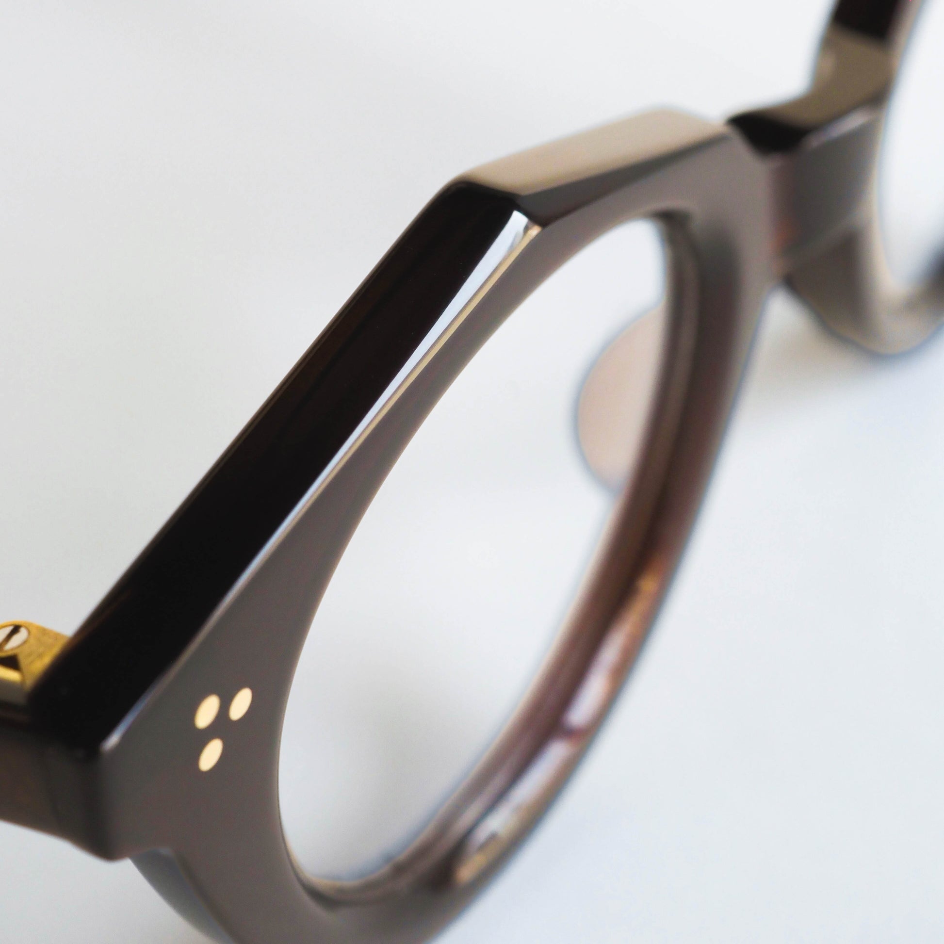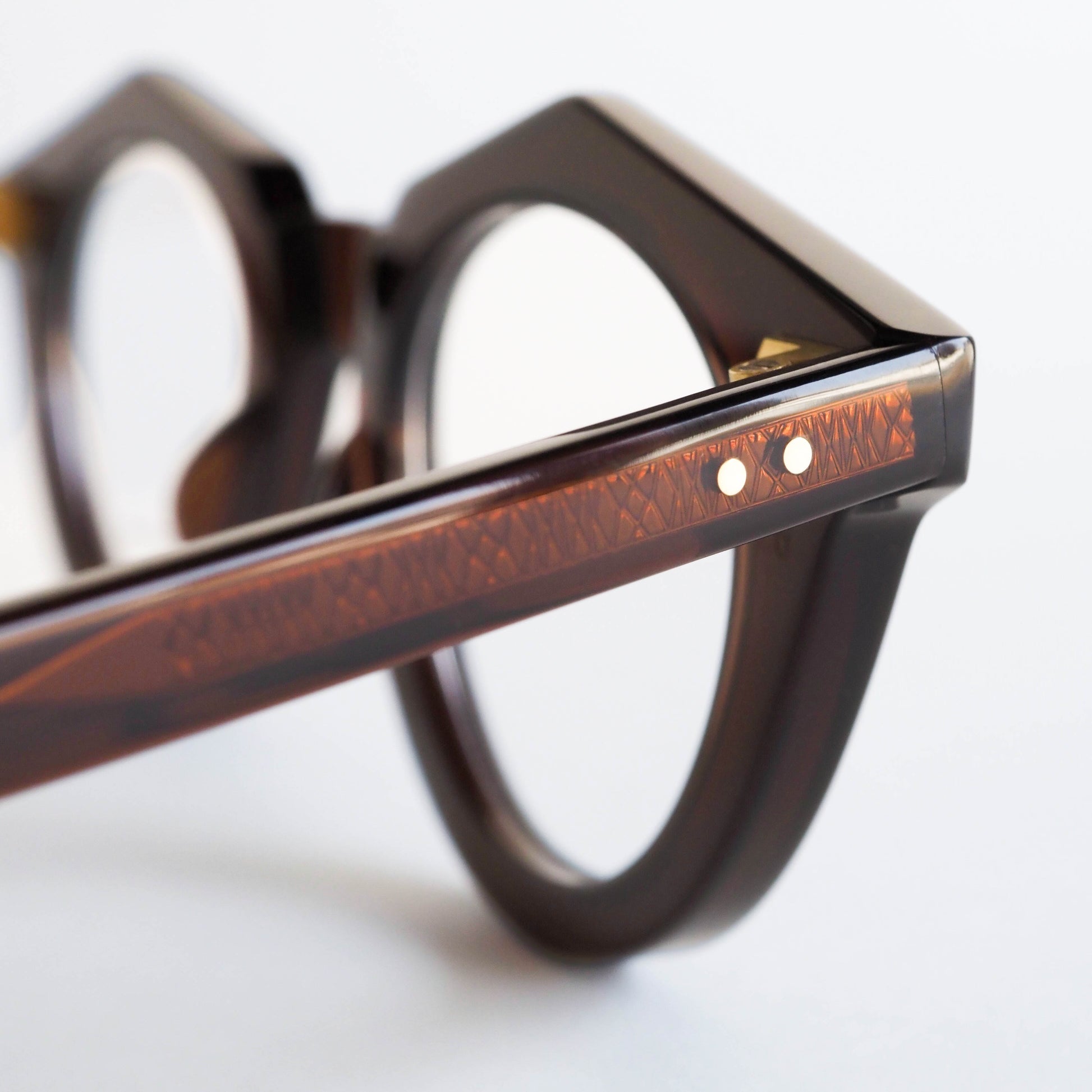 蝶番には、ヴィンテージアイウェアにも多く用いられてきた真鍮素材を採用。使い込むほどに風合いを増す経年変化も、このモデルならではの楽しみのひとつです。