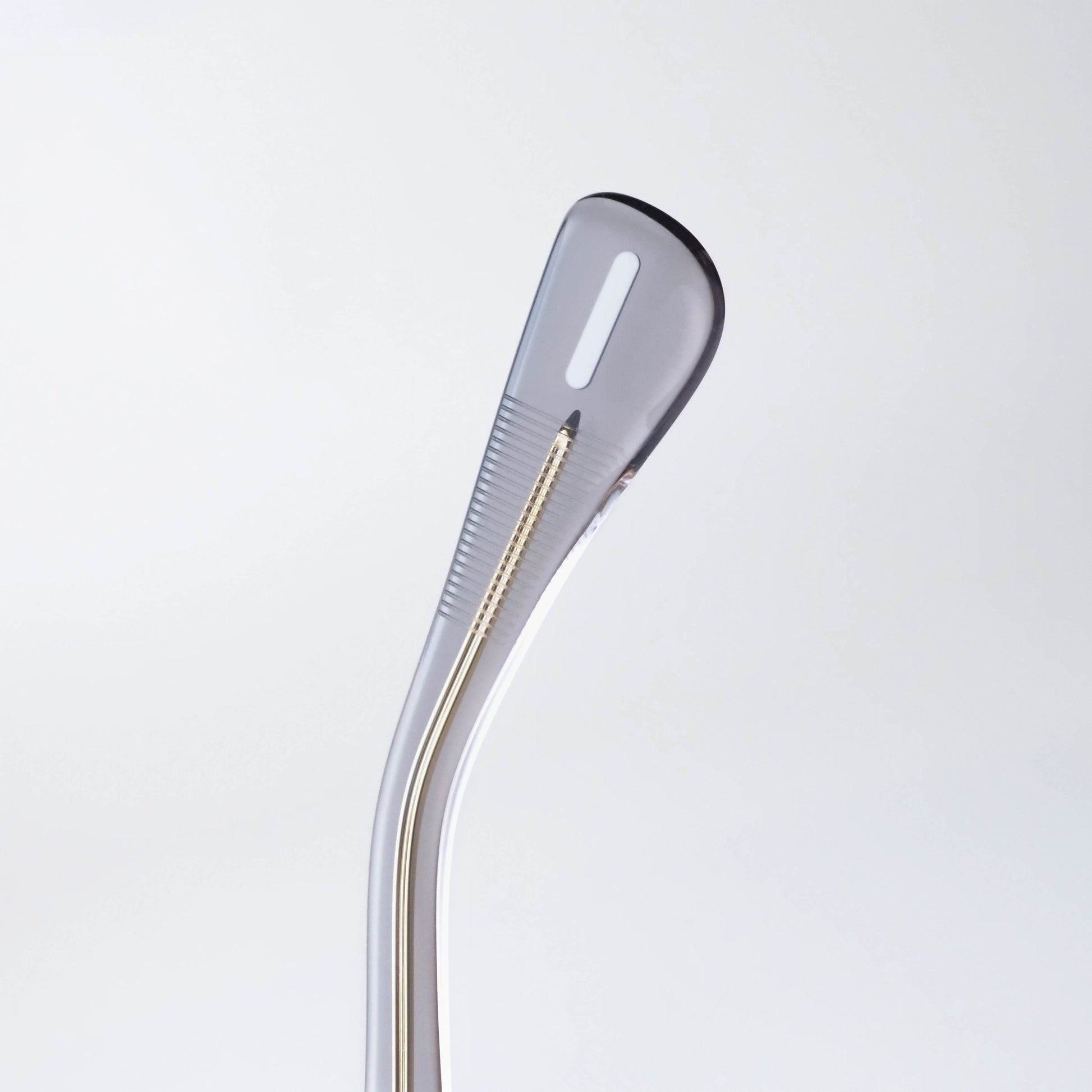 クリアグレーの軽やかさと、内側から覗くゴールドの華やかさ。力強いフォルムを、現代的なバランスで楽しめる一本です。