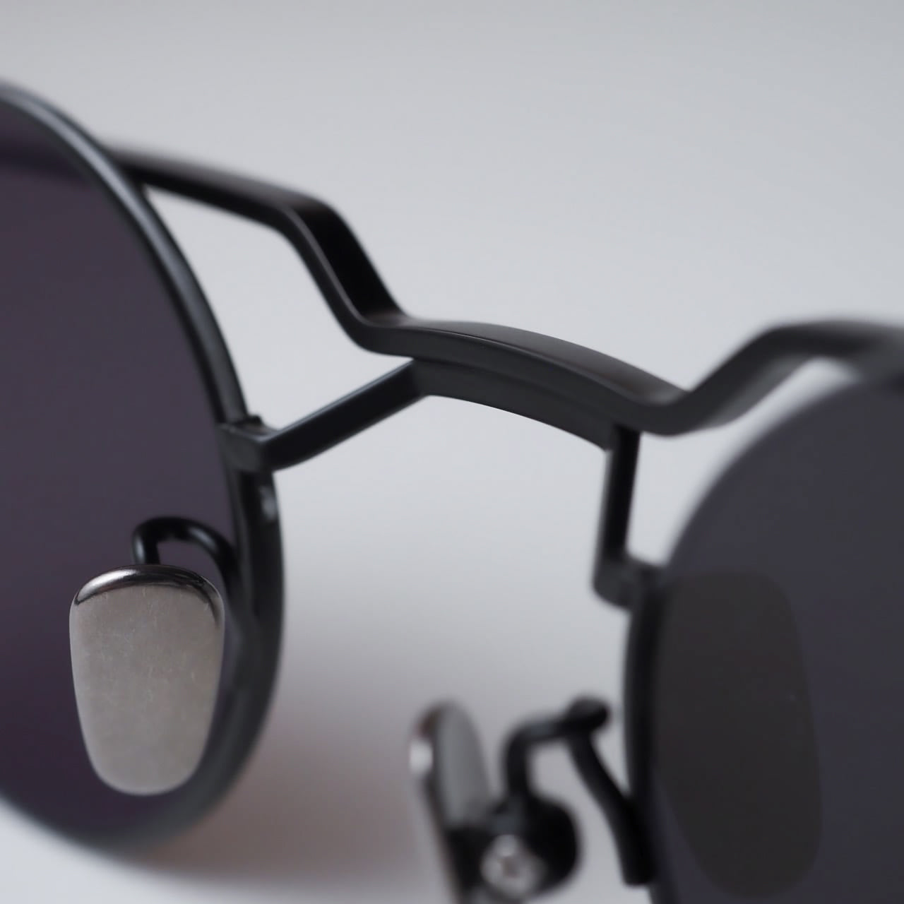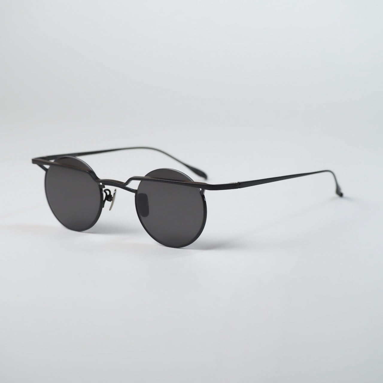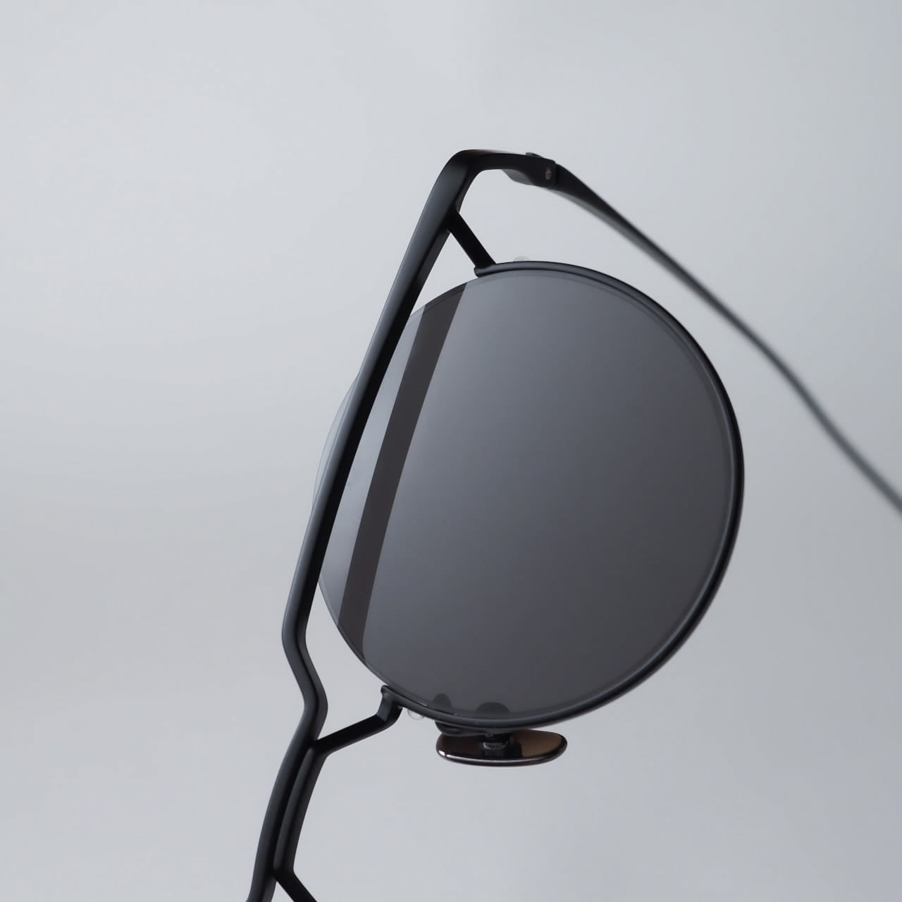 最大の特徴は、フロントリムに施された“浮遊するような”多層構造。レンズ周囲のメタルリムとフレームラインの間に生まれる空間は、陰影を意図的に生み出すことで、光の角度によって表情を変える動的なデザインとなっています。