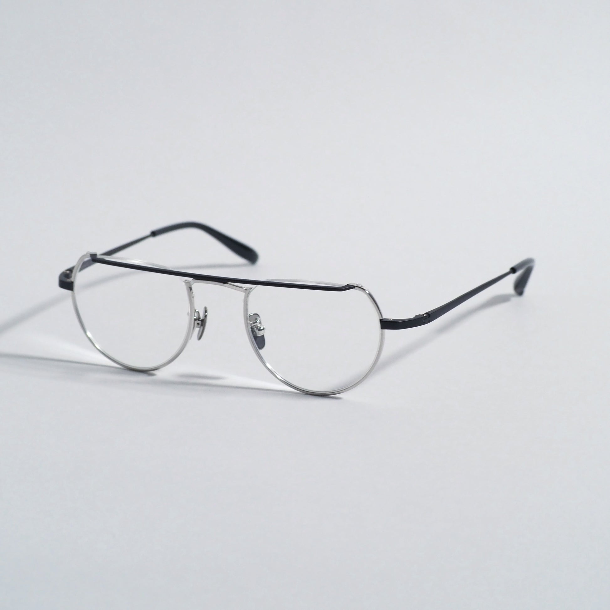 YA-041は、上リムの直線と下側のゆとりあるラウンドを合わせた独自の存在感を放つメタルフレーム。ハイブリッジがリムの中央で接し、さりげなくダブルブリッジ風の抜け感を演出しています。